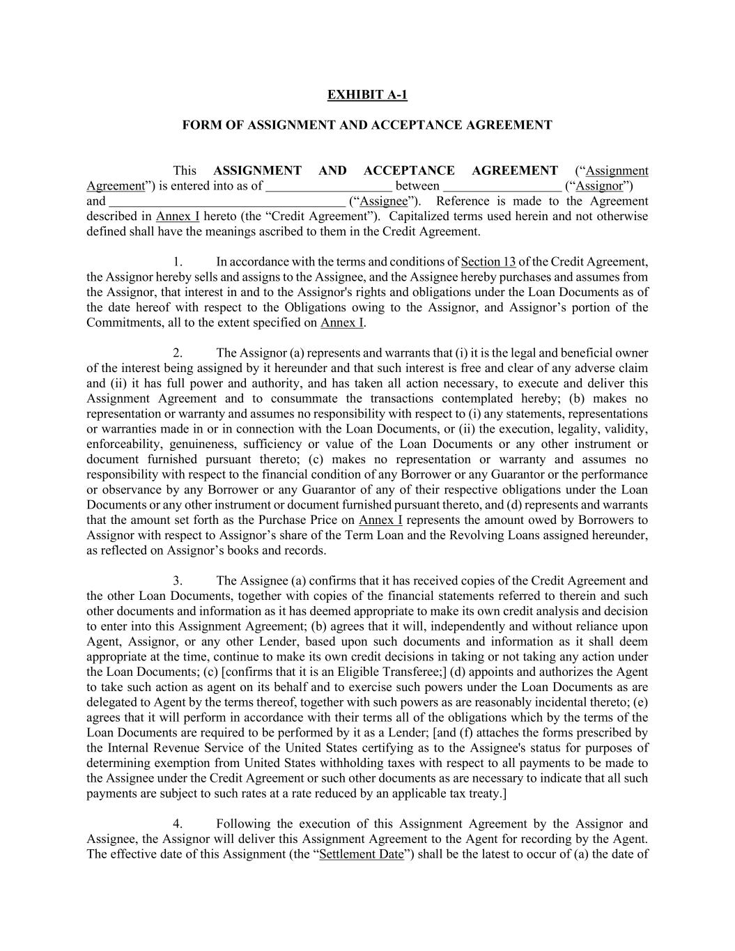 EXHIBIT A-1 FORM OF ASSIGNMENT AND ACCEPTANCE AGREEMENT This ASSIGNMENT AND ACCEPTANCE AGREEMENT (“Assignment Agreement”) is entered into as of between (“Assignor”) and (“Assignee”). Reference is made to the Agreement described in Annex I hereto (the “Credit Agreement”). Capitalized terms used herein and not otherwise defined shall have the meanings ascribed to them in the Credit Agreement. 1. In accordance with the terms and conditions of Section 13 of the Credit Agreement, the Assignor hereby sells and assigns to the Assignee, and the Assignee hereby purchases and assumes from the Assignor, that interest in and to the Assignor's rights and obligations under the Loan Documents as of the date hereof with respect to the Obligations owing to the Assignor, and Assignor’s portion of the Commitments, all to the extent specified on Annex I. 2. The Assignor (a) represents and warrants that (i) it is the legal and beneficial owner of the interest being assigned by it hereunder and that such interest is free and clear of any adverse claim and (ii) it has full power and authority, and has taken all action necessary, to execute and deliver this Assignment Agreement and to consummate the transactions contemplated hereby; (b) makes no representation or warranty and assumes no responsibility with respect to (i) any statements, representations or warranties made in or in connection with the Loan Documents, or (ii) the execution, legality, validity, enforceability, genuineness, sufficiency or value of the Loan Documents or any other instrument or document furnished pursuant thereto; (c) makes no representation or warranty and assumes no responsibility with respect to the financial condition of any Borrower or any Guarantor or the performance or observance by any Borrower or any Guarantor of any of their respective obligations under the Loan Documents or any other instrument or document furnished pursuant thereto, and (d) represents and warrants that the amount set forth as the Purchase Price on Annex I represents the amount owed by Borrowers to Assignor with respect to Assignor’s share of the Term Loan and the Revolving Loans assigned hereunder, as reflected on Assignor’s books and records. 3. The Assignee (a) confirms that it has received copies of the Credit Agreement and the other Loan Documents, together with copies of the financial statements referred to therein and such other documents and information as it has deemed appropriate to make its own credit analysis and decision to enter into this Assignment Agreement; (b) agrees that it will, independently and without reliance upon Agent, Assignor, or any other Lender, based upon such documents and information as it shall deem appropriate at the time, continue to make its own credit decisions in taking or not taking any action under the Loan Documents; (c) [confirms that it is an Eligible Transferee;] (d) appoints and authorizes the Agent to take such action as agent on its behalf and to exercise such powers under the Loan Documents as are delegated to Agent by the terms thereof, together with such powers as are reasonably incidental thereto; (e) agrees that it will perform in accordance with their terms all of the obligations which by the terms of the Loan Documents are required to be performed by it as a Lender; [and (f) attaches the forms prescribed by the Internal Revenue Service of the United States certifying as to the Assignee's status for purposes of determining exemption from United States withholding taxes with respect to all payments to be made to the Assignee under the Credit Agreement or such other documents as are necessary to indicate that all such payments are subject to such rates at a rate reduced by an applicable tax treaty.] 4. Following the execution of this Assignment Agreement by the Assignor and Assignee, the Assignor will deliver this Assignment Agreement to the Agent for recording by the Agent. The effective date of this Assignment (the “Settlement Date”) shall be the latest to occur of (a) the date of
