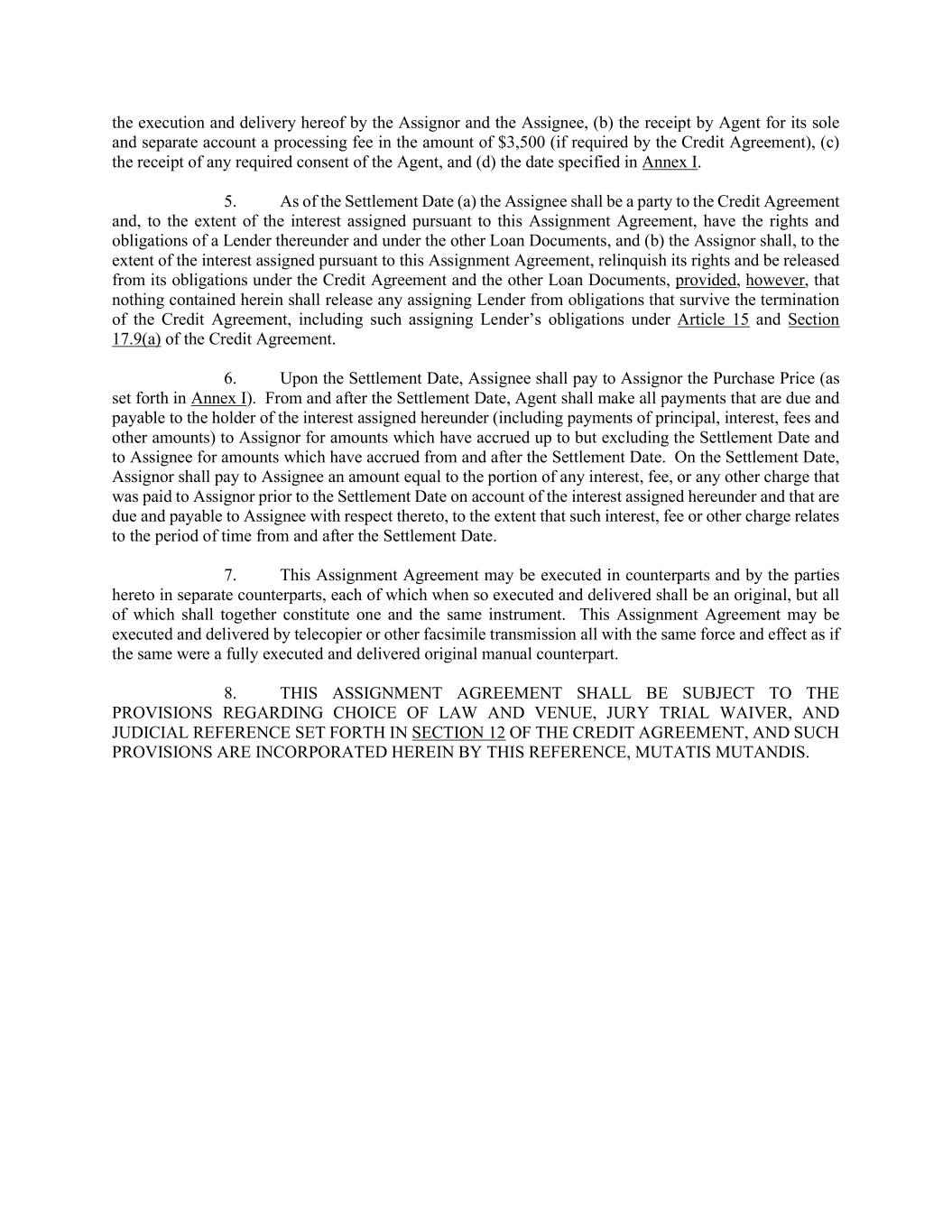 the execution and delivery hereof by the Assignor and the Assignee, (b) the receipt by Agent for its sole and separate account a processing fee in the amount of $3,500 (if required by the Credit Agreement), (c) the receipt of any required consent of the Agent, and (d) the date specified in Annex I. 5. As of the Settlement Date (a) the Assignee shall be a party to the Credit Agreement and, to the extent of the interest assigned pursuant to this Assignment Agreement, have the rights and obligations of a Lender thereunder and under the other Loan Documents, and (b) the Assignor shall, to the extent of the interest assigned pursuant to this Assignment Agreement, relinquish its rights and be released from its obligations under the Credit Agreement and the other Loan Documents, provided, however, that nothing contained herein shall release any assigning Lender from obligations that survive the termination of the Credit Agreement, including such assigning Lender’s obligations under Article 15 and Section 17.9(a) of the Credit Agreement. 6. Upon the Settlement Date, Assignee shall pay to Assignor the Purchase Price (as set forth in Annex I). From and after the Settlement Date, Agent shall make all payments that are due and payable to the holder of the interest assigned hereunder (including payments of principal, interest, fees and other amounts) to Assignor for amounts which have accrued up to but excluding the Settlement Date and to Assignee for amounts which have accrued from and after the Settlement Date. On the Settlement Date, Assignor shall pay to Assignee an amount equal to the portion of any interest, fee, or any other charge that was paid to Assignor prior to the Settlement Date on account of the interest assigned hereunder and that are due and payable to Assignee with respect thereto, to the extent that such interest, fee or other charge relates to the period of time from and after the Settlement Date. 7. This Assignment Agreement may be executed in counterparts and by the parties hereto in separate counterparts, each of which when so executed and delivered shall be an original, but all of which shall together constitute one and the same instrument. This Assignment Agreement may be executed and delivered by telecopier or other facsimile transmission all with the same force and effect as if the same were a fully executed and delivered original manual counterpart. 8. THIS ASSIGNMENT AGREEMENT SHALL BE SUBJECT TO THE PROVISIONS REGARDING CHOICE OF LAW AND VENUE, JURY TRIAL WAIVER, AND JUDICIAL REFERENCE SET FORTH IN SECTION 12 OF THE CREDIT AGREEMENT, AND SUCH PROVISIONS ARE INCORPORATED HEREIN BY THIS REFERENCE, MUTATIS MUTANDIS.