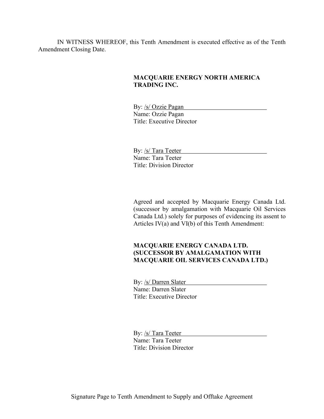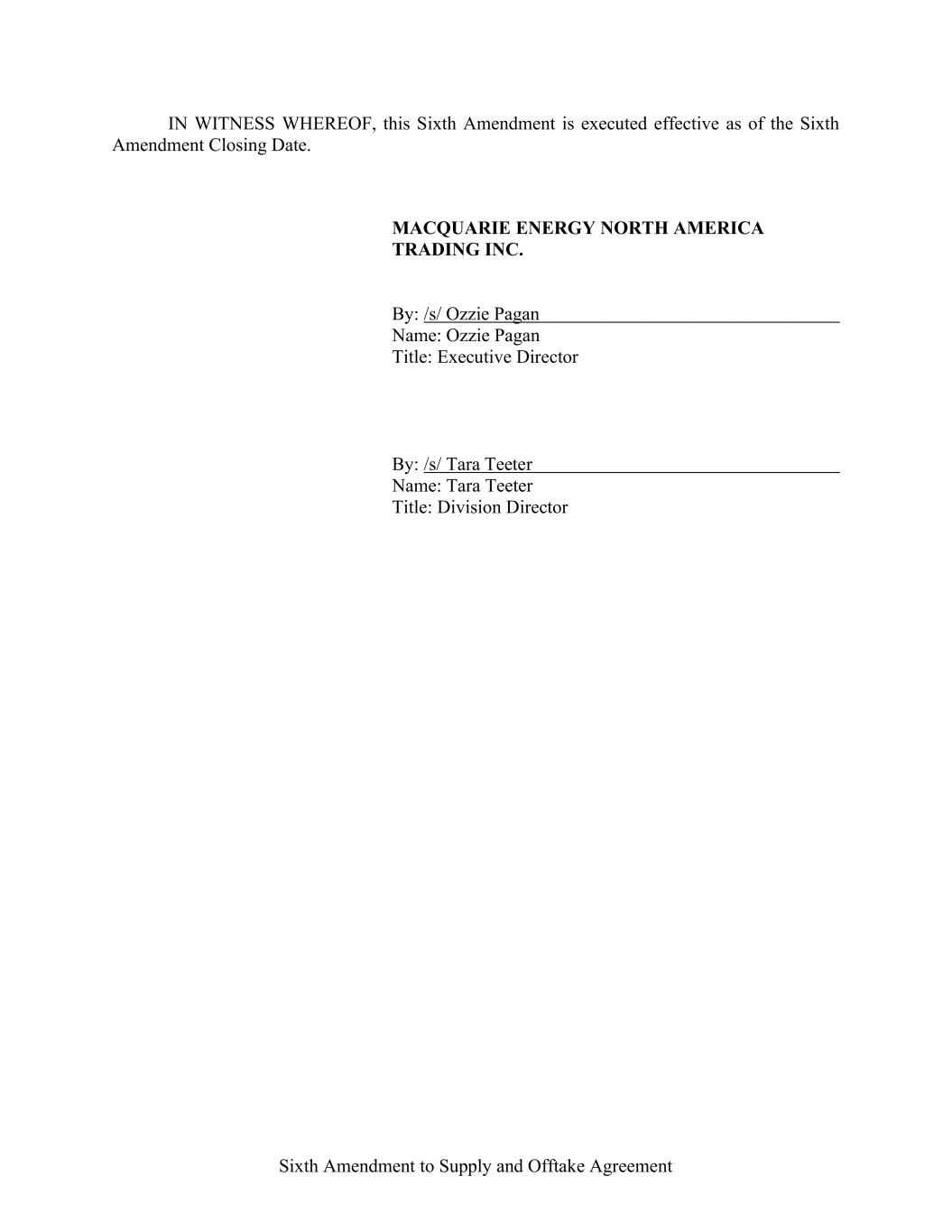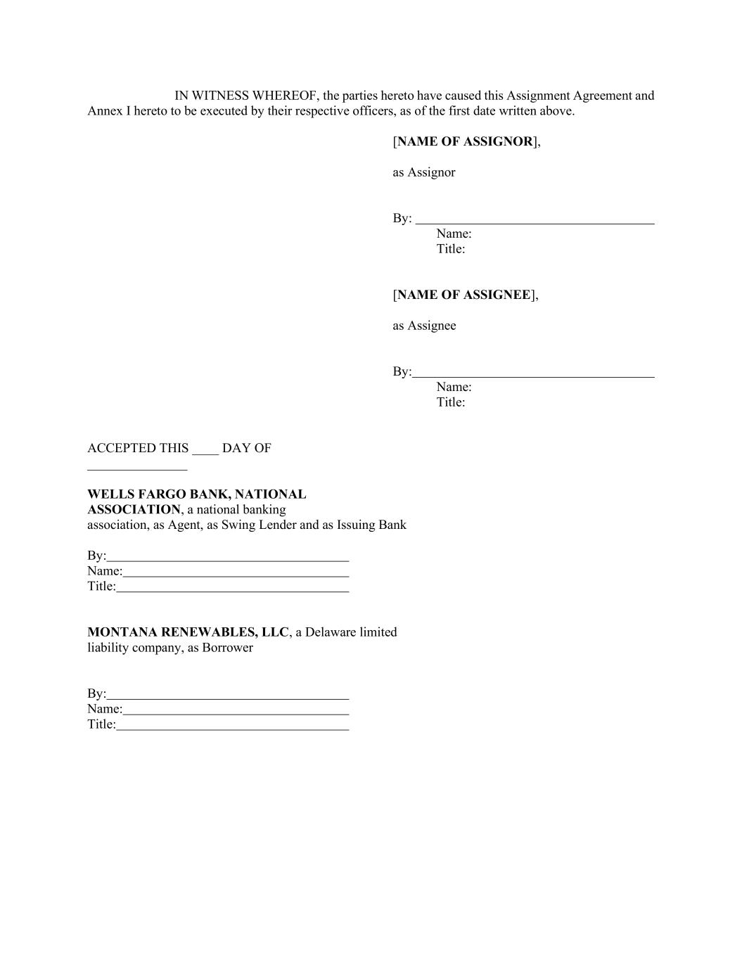 IN WITNESS WHEREOF, the parties hereto have caused this Assignment Agreement and Annex I hereto to be executed by their respective officers, as of the first date written above. [NAME OF ASSIGNOR], as Assignor By: Name: Title: [NAME OF ASSIGNEE], as Assignee By: Name: Title: ACCEPTED THIS ____ DAY OF _______________ WELLS FARGO BANK, NATIONAL ASSOCIATION, a national banking association, as Agent, as Swing Lender and as Issuing Bank By: Name: Title: MONTANA RENEWABLES, LLC, a Delaware limited liability company, as Borrower By: Name: Title: