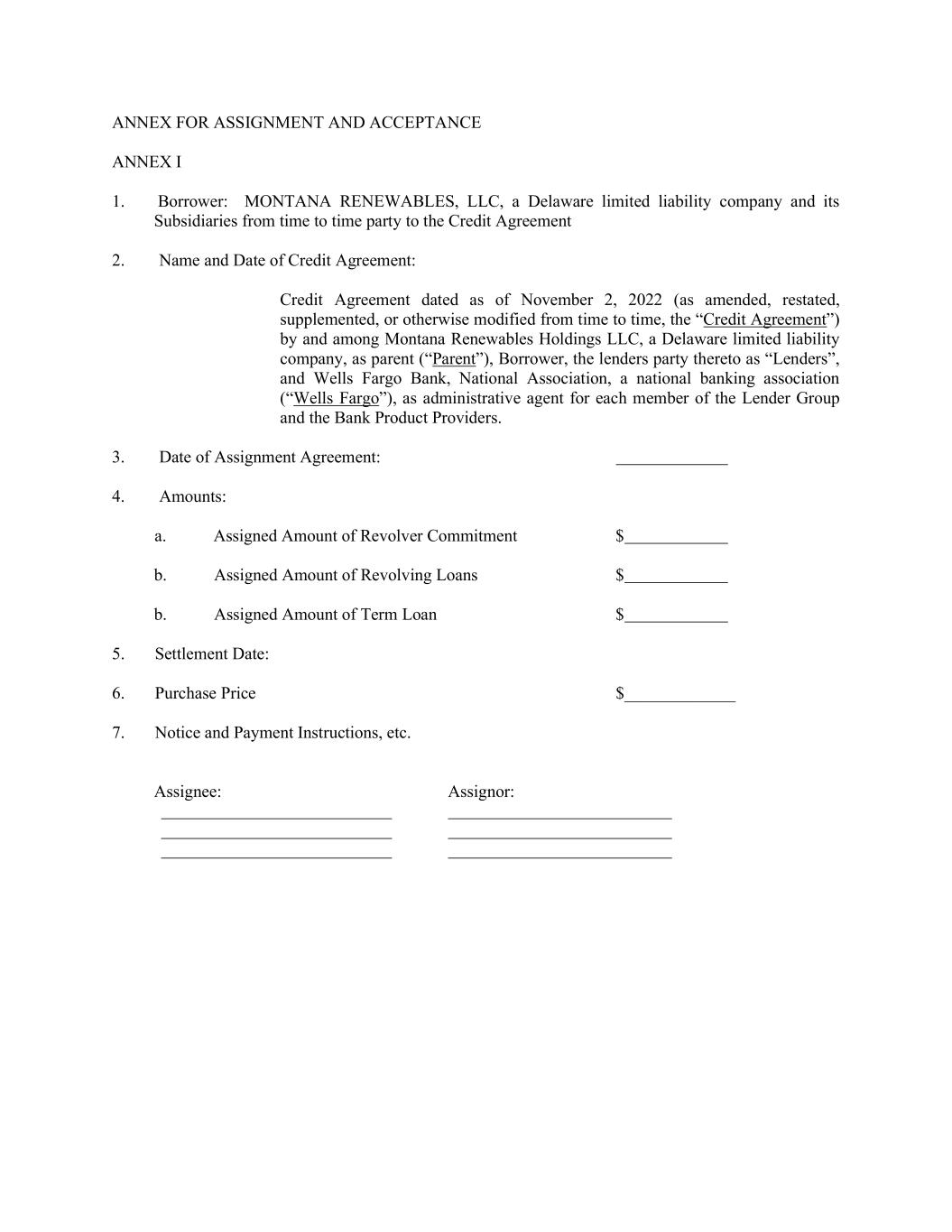 ANNEX FOR ASSIGNMENT AND ACCEPTANCE ANNEX I 1. Borrower: MONTANA RENEWABLES, LLC, a Delaware limited liability company and its Subsidiaries from time to time party to the Credit Agreement 2. Name and Date of Credit Agreement: Credit Agreement dated as of November 2, 2022 (as amended, restated, supplemented, or otherwise modified from time to time, the “Credit Agreement”) by and among Montana Renewables Holdings LLC, a Delaware limited liability company, as parent (“Parent”), Borrower, the lenders party thereto as “Lenders”, and Wells Fargo Bank, National Association, a national banking association (“Wells Fargo”), as administrative agent for each member of the Lender Group and the Bank Product Providers. 3. Date of Assignment Agreement: 4. Amounts: a. Assigned Amount of Revolver Commitment $ b. Assigned Amount of Revolving Loans $ b. Assigned Amount of Term Loan $ 5. Settlement Date: 6. Purchase Price $_____________ 7. Notice and Payment Instructions, etc. Assignee: Assignor: