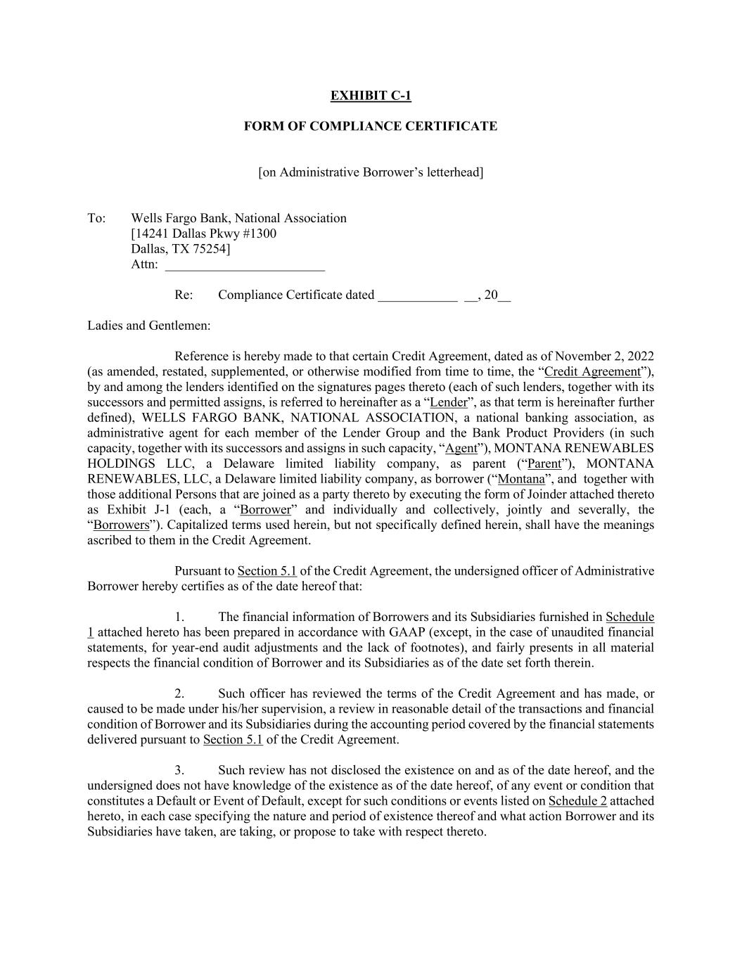 EXHIBIT C-1 FORM OF COMPLIANCE CERTIFICATE [on Administrative Borrower’s letterhead] To: Wells Fargo Bank, National Association [14241 Dallas Pkwy #1300 Dallas, TX 75254] Attn: ________________________ Re: Compliance Certificate dated ____________ __, 20__ Ladies and Gentlemen: Reference is hereby made to that certain Credit Agreement, dated as of November 2, 2022 (as amended, restated, supplemented, or otherwise modified from time to time, the “Credit Agreement”), by and among the lenders identified on the signatures pages thereto (each of such lenders, together with its successors and permitted assigns, is referred to hereinafter as a “Lender”, as that term is hereinafter further defined), WELLS FARGO BANK, NATIONAL ASSOCIATION, a national banking association, as administrative agent for each member of the Lender Group and the Bank Product Providers (in such capacity, together with its successors and assigns in such capacity, “Agent”), MONTANA RENEWABLES HOLDINGS LLC, a Delaware limited liability company, as parent (“Parent”), MONTANA RENEWABLES, LLC, a Delaware limited liability company, as borrower (“Montana”, and together with those additional Persons that are joined as a party thereto by executing the form of Joinder attached thereto as Exhibit J-1 (each, a “Borrower” and individually and collectively, jointly and severally, the “Borrowers”). Capitalized terms used herein, but not specifically defined herein, shall have the meanings ascribed to them in the Credit Agreement. Pursuant to Section 5.1 of the Credit Agreement, the undersigned officer of Administrative Borrower hereby certifies as of the date hereof that: 1. The financial information of Borrowers and its Subsidiaries furnished in Schedule 1 attached hereto has been prepared in accordance with GAAP (except, in the case of unaudited financial statements, for year-end audit adjustments and the lack of footnotes), and fairly presents in all material respects the financial condition of Borrower and its Subsidiaries as of the date set forth therein. 2. Such officer has reviewed the terms of the Credit Agreement and has made, or caused to be made under his/her supervision, a review in reasonable detail of the transactions and financial condition of Borrower and its Subsidiaries during the accounting period covered by the financial statements delivered pursuant to Section 5.1 of the Credit Agreement. 3. Such review has not disclosed the existence on and as of the date hereof, and the undersigned does not have knowledge of the existence as of the date hereof, of any event or condition that constitutes a Default or Event of Default, except for such conditions or events listed on Schedule 2 attached hereto, in each case specifying the nature and period of existence thereof and what action Borrower and its Subsidiaries have taken, are taking, or propose to take with respect thereto.