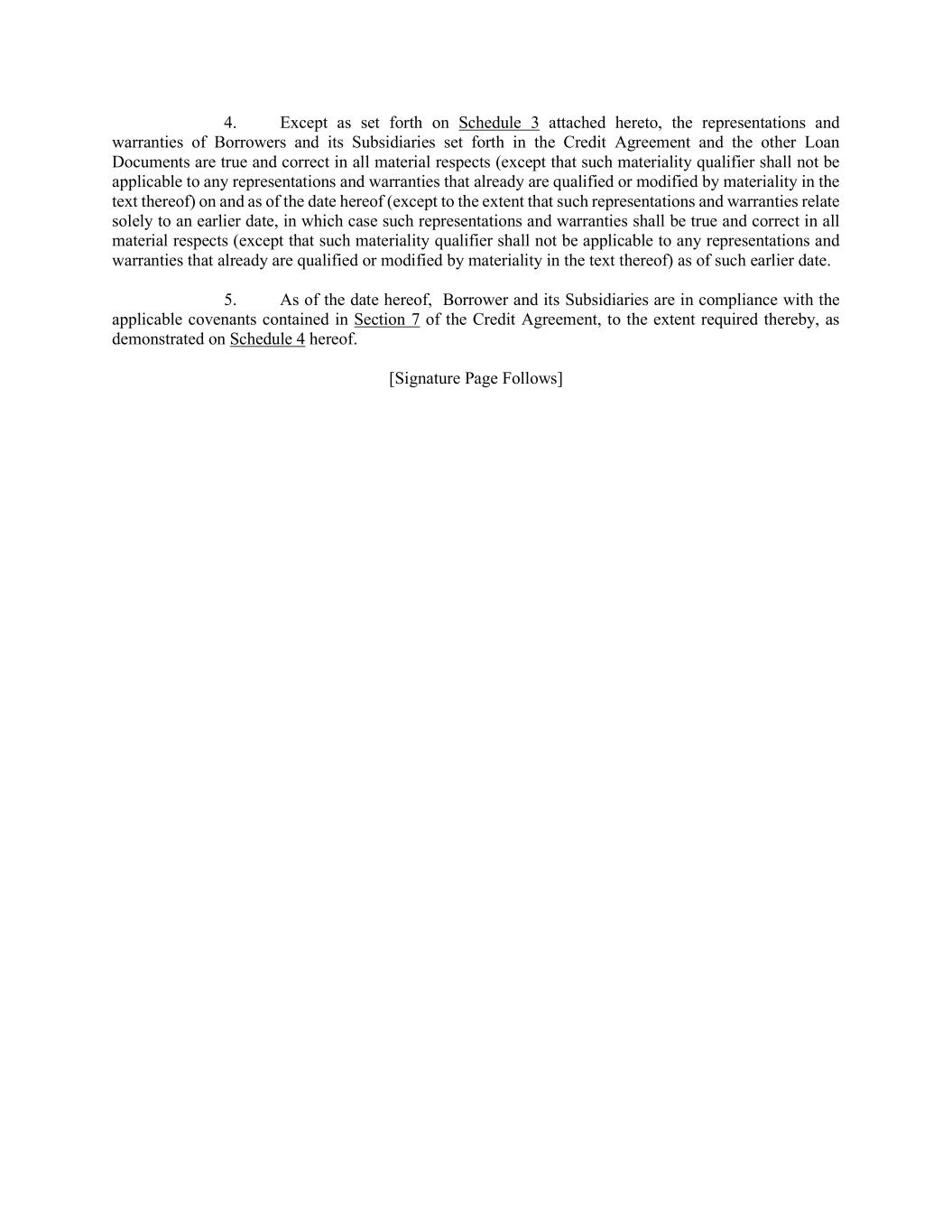 4. Except as set forth on Schedule 3 attached hereto, the representations and warranties of Borrowers and its Subsidiaries set forth in the Credit Agreement and the other Loan Documents are true and correct in all material respects (except that such materiality qualifier shall not be applicable to any representations and warranties that already are qualified or modified by materiality in the text thereof) on and as of the date hereof (except to the extent that such representations and warranties relate solely to an earlier date, in which case such representations and warranties shall be true and correct in all material respects (except that such materiality qualifier shall not be applicable to any representations and warranties that already are qualified or modified by materiality in the text thereof) as of such earlier date. 5. As of the date hereof, Borrower and its Subsidiaries are in compliance with the applicable covenants contained in Section 7 of the Credit Agreement, to the extent required thereby, as demonstrated on Schedule 4 hereof. [Signature Page Follows]