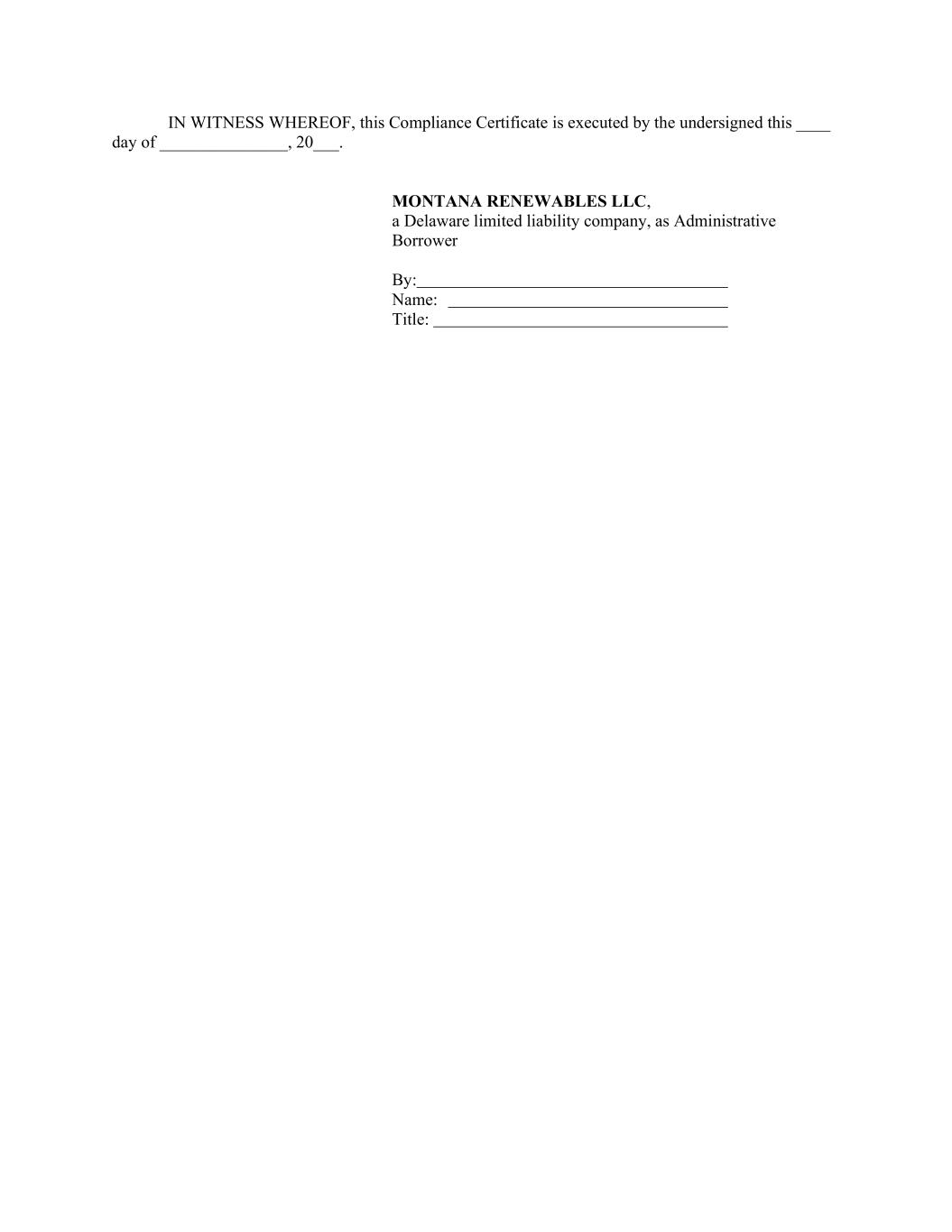 IN WITNESS WHEREOF, this Compliance Certificate is executed by the undersigned this ____ day of _______________, 20___. MONTANA RENEWABLES LLC, a Delaware limited liability company, as Administrative Borrower By: Name: Title: