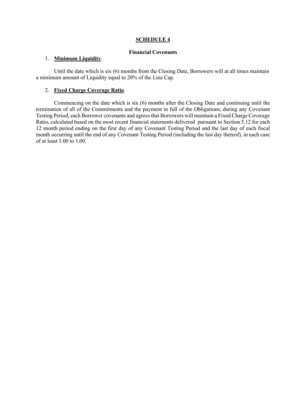 SCHEDULE 4 Financial Covenants 1. Minimum Liquidity. Until the date which is six (6) months from the Closing Date, Borrowers will at all times maintain a minimum amount of Liquidity equal to 20% of the Line Cap. 2. Fixed Charge Coverage Ratio. Commencing on the date which is six (6) months after the Closing Date and continuing until the termination of all of the Commitments and the payment in full of the Obligations, during any Covenant Testing Period, each Borrower covenants and agrees that Borrowers will maintain a Fixed Charge Coverage Ratio, calculated based on the most recent financial statements delivered pursuant to Section 5.12 for each 12 month period ending on the first day of any Covenant Testing Period and the last day of each fiscal month occurring until the end of any Covenant Testing Period (including the last day thereof), in each case of at least 1.00 to 1.00.