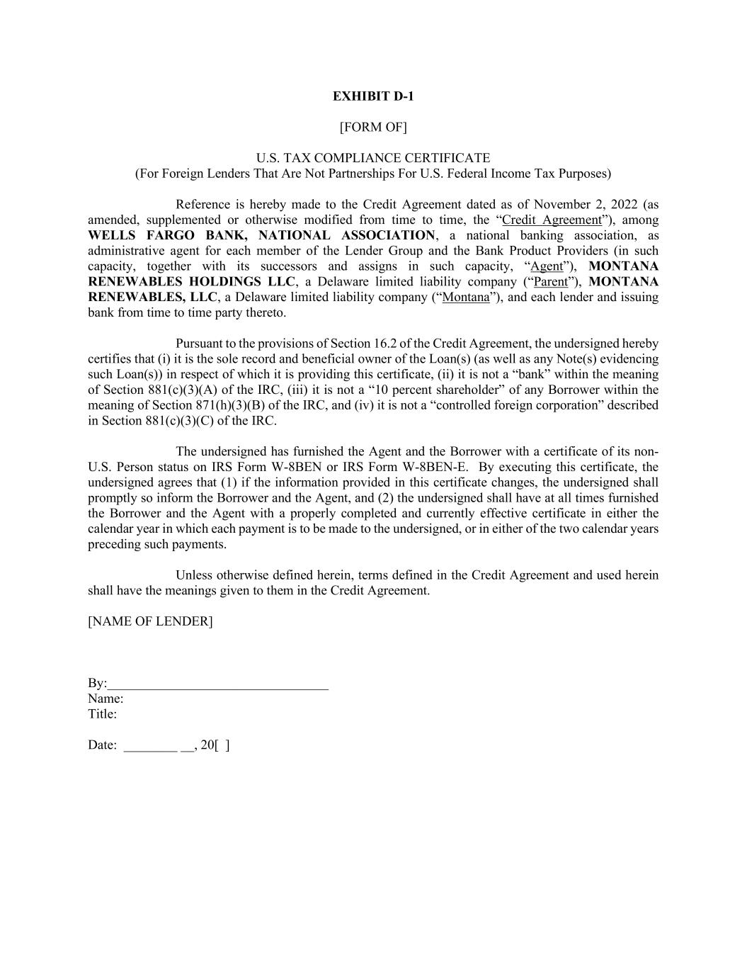 EXHIBIT D-1 [FORM OF] U.S. TAX COMPLIANCE CERTIFICATE (For Foreign Lenders That Are Not Partnerships For U.S. Federal Income Tax Purposes) Reference is hereby made to the Credit Agreement dated as of November 2, 2022 (as amended, supplemented or otherwise modified from time to time, the “Credit Agreement”), among WELLS FARGO BANK, NATIONAL ASSOCIATION, a national banking association, as administrative agent for each member of the Lender Group and the Bank Product Providers (in such capacity, together with its successors and assigns in such capacity, “Agent”), MONTANA RENEWABLES HOLDINGS LLC, a Delaware limited liability company (“Parent”), MONTANA RENEWABLES, LLC, a Delaware limited liability company (“Montana”), and each lender and issuing bank from time to time party thereto. Pursuant to the provisions of Section 16.2 of the Credit Agreement, the undersigned hereby certifies that (i) it is the sole record and beneficial owner of the Loan(s) (as well as any Note(s) evidencing such Loan(s)) in respect of which it is providing this certificate, (ii) it is not a “bank” within the meaning of Section 881(c)(3)(A) of the IRC, (iii) it is not a “10 percent shareholder” of any Borrower within the meaning of Section 871(h)(3)(B) of the IRC, and (iv) it is not a “controlled foreign corporation” described in Section 881(c)(3)(C) of the IRC. The undersigned has furnished the Agent and the Borrower with a certificate of its non- U.S. Person status on IRS Form W-8BEN or IRS Form W-8BEN-E. By executing this certificate, the undersigned agrees that (1) if the information provided in this certificate changes, the undersigned shall promptly so inform the Borrower and the Agent, and (2) the undersigned shall have at all times furnished the Borrower and the Agent with a properly completed and currently effective certificate in either the calendar year in which each payment is to be made to the undersigned, or in either of the two calendar years preceding such payments. Unless otherwise defined herein, terms defined in the Credit Agreement and used herein shall have the meanings given to them in the Credit Agreement. [NAME OF LENDER] By:_________________________________ Name: Title: Date: ________ __, 20[ ]