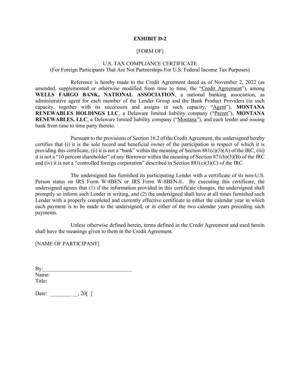 EXHIBIT D-2 [FORM OF] U.S. TAX COMPLIANCE CERTIFICATE (For Foreign Participants That Are Not Partnerships For U.S. Federal Income Tax Purposes) Reference is hereby made to the Credit Agreement dated as of November 2, 2022 (as amended, supplemented or otherwise modified from time to time, the “Credit Agreement”), among WELLS FARGO BANK, NATIONAL ASSOCIATION, a national banking association, as administrative agent for each member of the Lender Group and the Bank Product Providers (in such capacity, together with its successors and assigns in such capacity, “Agent”), MONTANA RENEWABLES HOLDINGS LLC, a Delaware limited liability company (“Parent”), MONTANA RENEWABLES, LLC, a Delaware limited liability company (“Montana”), and each lender and issuing bank from time to time party thereto. Pursuant to the provisions of Section 16.2 of the Credit Agreement, the undersigned hereby certifies that (i) it is the sole record and beneficial owner of the participation in respect of which it is providing this certificate, (ii) it is not a “bank” within the meaning of Section 881(c)(3)(A) of the IRC, (iii) it is not a “10 percent shareholder” of any Borrower within the meaning of Section 871(h)(3)(B) of the IRC and (iv) it is not a “controlled foreign corporation” described in Section 881(c)(3)(C) of the IRC. The undersigned has furnished its participating Lender with a certificate of its non-U.S. Person status on IRS Form W-8BEN or IRS Form W-8BEN-E. By executing this certificate, the undersigned agrees that (1) if the information provided in this certificate changes, the undersigned shall promptly so inform such Lender in writing, and (2) the undersigned shall have at all times furnished such Lender with a properly completed and currently effective certificate in either the calendar year in which each payment is to be made to the undersigned, or in either of the two calendar years preceding such payments. Unless otherwise defined herein, terms defined in the Credit Agreement and used herein shall have the meanings given to them in the Credit Agreement. [NAME OF PARTICIPANT] By:_________________________________ Name: Title: Date: ________ __, 20[ ]
