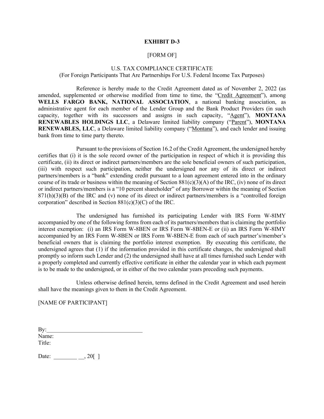 EXHIBIT D-3 [FORM OF] U.S. TAX COMPLIANCE CERTIFICATE (For Foreign Participants That Are Partnerships For U.S. Federal Income Tax Purposes) Reference is hereby made to the Credit Agreement dated as of November 2, 2022 (as amended, supplemented or otherwise modified from time to time, the “Credit Agreement”), among WELLS FARGO BANK, NATIONAL ASSOCIATION, a national banking association, as administrative agent for each member of the Lender Group and the Bank Product Providers (in such capacity, together with its successors and assigns in such capacity, “Agent”), MONTANA RENEWABLES HOLDINGS LLC, a Delaware limited liability company (“Parent”), MONTANA RENEWABLES, LLC, a Delaware limited liability company (“Montana”), and each lender and issuing bank from time to time party thereto. Pursuant to the provisions of Section 16.2 of the Credit Agreement, the undersigned hereby certifies that (i) it is the sole record owner of the participation in respect of which it is providing this certificate, (ii) its direct or indirect partners/members are the sole beneficial owners of such participation, (iii) with respect such participation, neither the undersigned nor any of its direct or indirect partners/members is a “bank” extending credit pursuant to a loan agreement entered into in the ordinary course of its trade or business within the meaning of Section 881(c)(3)(A) of the IRC, (iv) none of its direct or indirect partners/members is a “10 percent shareholder” of any Borrower within the meaning of Section 871(h)(3)(B) of the IRC and (v) none of its direct or indirect partners/members is a “controlled foreign corporation” described in Section 881(c)(3)(C) of the IRC. The undersigned has furnished its participating Lender with IRS Form W-8IMY accompanied by one of the following forms from each of its partners/members that is claiming the portfolio interest exemption: (i) an IRS Form W-8BEN or IRS Form W-8BEN-E or (ii) an IRS Form W-8IMY accompanied by an IRS Form W-8BEN or IRS Form W-8BEN-E from each of such partner’s/member’s beneficial owners that is claiming the portfolio interest exemption. By executing this certificate, the undersigned agrees that (1) if the information provided in this certificate changes, the undersigned shall promptly so inform such Lender and (2) the undersigned shall have at all times furnished such Lender with a properly completed and currently effective certificate in either the calendar year in which each payment is to be made to the undersigned, or in either of the two calendar years preceding such payments. Unless otherwise defined herein, terms defined in the Credit Agreement and used herein shall have the meanings given to them in the Credit Agreement. [NAME OF PARTICIPANT] By:_________________________________ Name: Title: Date: ________ __, 20[ ]