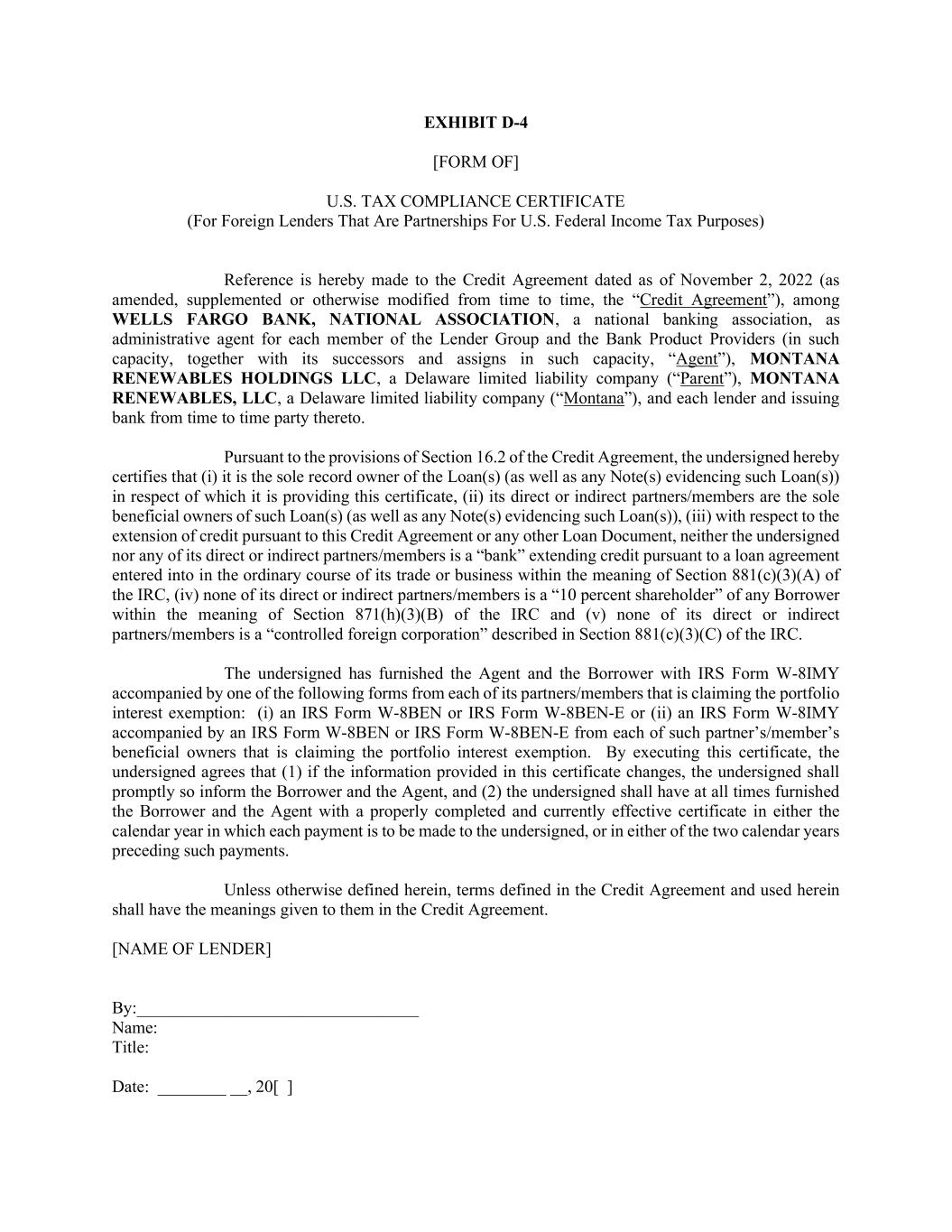 EXHIBIT D-4 [FORM OF] U.S. TAX COMPLIANCE CERTIFICATE (For Foreign Lenders That Are Partnerships For U.S. Federal Income Tax Purposes) Reference is hereby made to the Credit Agreement dated as of November 2, 2022 (as amended, supplemented or otherwise modified from time to time, the “Credit Agreement”), among WELLS FARGO BANK, NATIONAL ASSOCIATION, a national banking association, as administrative agent for each member of the Lender Group and the Bank Product Providers (in such capacity, together with its successors and assigns in such capacity, “Agent”), MONTANA RENEWABLES HOLDINGS LLC, a Delaware limited liability company (“Parent”), MONTANA RENEWABLES, LLC, a Delaware limited liability company (“Montana”), and each lender and issuing bank from time to time party thereto. Pursuant to the provisions of Section 16.2 of the Credit Agreement, the undersigned hereby certifies that (i) it is the sole record owner of the Loan(s) (as well as any Note(s) evidencing such Loan(s)) in respect of which it is providing this certificate, (ii) its direct or indirect partners/members are the sole beneficial owners of such Loan(s) (as well as any Note(s) evidencing such Loan(s)), (iii) with respect to the extension of credit pursuant to this Credit Agreement or any other Loan Document, neither the undersigned nor any of its direct or indirect partners/members is a “bank” extending credit pursuant to a loan agreement entered into in the ordinary course of its trade or business within the meaning of Section 881(c)(3)(A) of the IRC, (iv) none of its direct or indirect partners/members is a “10 percent shareholder” of any Borrower within the meaning of Section 871(h)(3)(B) of the IRC and (v) none of its direct or indirect partners/members is a “controlled foreign corporation” described in Section 881(c)(3)(C) of the IRC. The undersigned has furnished the Agent and the Borrower with IRS Form W-8IMY accompanied by one of the following forms from each of its partners/members that is claiming the portfolio interest exemption: (i) an IRS Form W-8BEN or IRS Form W-8BEN-E or (ii) an IRS Form W-8IMY accompanied by an IRS Form W-8BEN or IRS Form W-8BEN-E from each of such partner’s/member’s beneficial owners that is claiming the portfolio interest exemption. By executing this certificate, the undersigned agrees that (1) if the information provided in this certificate changes, the undersigned shall promptly so inform the Borrower and the Agent, and (2) the undersigned shall have at all times furnished the Borrower and the Agent with a properly completed and currently effective certificate in either the calendar year in which each payment is to be made to the undersigned, or in either of the two calendar years preceding such payments. Unless otherwise defined herein, terms defined in the Credit Agreement and used herein shall have the meanings given to them in the Credit Agreement. [NAME OF LENDER] By:_________________________________ Name: Title: Date: ________ __, 20[ ]