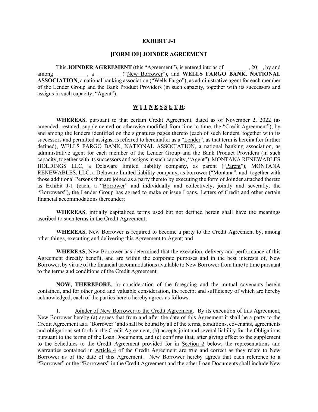 EXHIBIT J-1 [FORM OF] JOINDER AGREEMENT This JOINDER AGREEMENT (this “Agreement”), is entered into as of ______ __, 20__, by and among ___________, a ________ (“New Borrower”), and WELLS FARGO BANK, NATIONAL ASSOCIATION, a national banking association (“Wells Fargo”), as administrative agent for each member of the Lender Group and the Bank Product Providers (in such capacity, together with its successors and assigns in such capacity, “Agent”). W I T N E S S E T H: WHEREAS, pursuant to that certain Credit Agreement, dated as of November 2, 2022 (as amended, restated, supplemented or otherwise modified from time to time, the “Credit Agreement”), by and among the lenders identified on the signatures pages thereto (each of such lenders, together with its successors and permitted assigns, is referred to hereinafter as a “Lender”, as that term is hereinafter further defined), WELLS FARGO BANK, NATIONAL ASSOCIATION, a national banking association, as administrative agent for each member of the Lender Group and the Bank Product Providers (in such capacity, together with its successors and assigns in such capacity, “Agent”), MONTANA RENEWABLES HOLDINGS LLC, a Delaware limited liability company, as parent (“Parent”), MONTANA RENEWABLES, LLC, a Delaware limited liability company, as borrower (“Montana”, and together with those additional Persons that are joined as a party thereto by executing the form of Joinder attached thereto as Exhibit J-1 (each, a “Borrower” and individually and collectively, jointly and severally, the “Borrowers”), the Lender Group has agreed to make or issue Loans, Letters of Credit and other certain financial accommodations thereunder; WHEREAS, initially capitalized terms used but not defined herein shall have the meanings ascribed to such terms in the Credit Agreement; WHEREAS, New Borrower is required to become a party to the Credit Agreement by, among other things, executing and delivering this Agreement to Agent; and WHEREAS, New Borrower has determined that the execution, delivery and performance of this Agreement directly benefit, and are within the corporate purposes and in the best interests of, New Borrower, by virtue of the financial accommodations available to New Borrower from time to time pursuant to the terms and conditions of the Credit Agreement. NOW, THEREFORE, in consideration of the foregoing and the mutual covenants herein contained, and for other good and valuable consideration, the receipt and sufficiency of which are hereby acknowledged, each of the parties hereto hereby agrees as follows: 1. Joinder of New Borrower to the Credit Agreement. By its execution of this Agreement, New Borrower hereby (a) agrees that from and after the date of this Agreement it shall be a party to the Credit Agreement as a “Borrower” and shall be bound by all of the terms, conditions, covenants, agreements and obligations set forth in the Credit Agreement, (b) accepts joint and several liability for the Obligations pursuant to the terms of the Loan Documents, and (c) confirms that, after giving effect to the supplement to the Schedules to the Credit Agreement provided for in Section 2 below, the representations and warranties contained in Article 4 of the Credit Agreement are true and correct as they relate to New Borrower as of the date of this Agreement. New Borrower hereby agrees that each reference to a “Borrower” or the “Borrowers” in the Credit Agreement and the other Loan Documents shall include New
