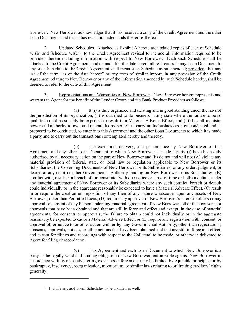 Borrower. New Borrower acknowledges that it has received a copy of the Credit Agreement and the other Loan Documents and that it has read and understands the terms thereof. 2. Updated Schedules. Attached as Exhibit A hereto are updated copies of each of Schedule 4.1(b) and Schedule 4.1(c)1 to the Credit Agreement revised to include all information required to be provided therein including information with respect to New Borrower. Each such Schedule shall be attached to the Credit Agreement, and on and after the date hereof all references in any Loan Document to any such Schedule to the Credit Agreement shall mean such Schedule as so amended; provided, that any use of the term “as of the date hereof” or any term of similar import, in any provision of the Credit Agreement relating to New Borrower or any of the information amended by such Schedule hereby, shall be deemed to refer to the date of this Agreement. 3. Representations and Warranties of New Borrower. New Borrower hereby represents and warrants to Agent for the benefit of the Lender Group and the Bank Product Providers as follows: (a) It (i) is duly organized and existing and in good standing under the laws of the jurisdiction of its organization, (ii) is qualified to do business in any state where the failure to be so qualified could reasonably be expected to result in a Material Adverse Effect, and (iii) has all requisite power and authority to own and operate its properties, to carry on its business as now conducted and as proposed to be conducted, to enter into this Agreement and the other Loan Documents to which it is made a party and to carry out the transactions contemplated hereby and thereby. (b) The execution, delivery, and performance by New Borrower of this Agreement and any other Loan Document to which New Borrower is made a party (i) have been duly authorized by all necessary action on the part of New Borrower and (ii) do not and will not (A) violate any material provision of federal, state, or local law or regulation applicable to New Borrower or its Subsidiaries, the Governing Documents of New Borrower or its Subsidiaries, or any order, judgment, or decree of any court or other Governmental Authority binding on New Borrower or its Subsidiaries, (B) conflict with, result in a breach of, or constitute (with due notice or lapse of time or both) a default under any material agreement of New Borrower or its Subsidiaries where any such conflict, breach or default could individually or in the aggregate reasonably be expected to have a Material Adverse Effect, (C) result in or require the creation or imposition of any Lien of any nature whatsoever upon any assets of New Borrower, other than Permitted Liens, (D) require any approval of New Borrower’s interest holders or any approval or consent of any Person under any material agreement of New Borrower, other than consents or approvals that have been obtained and that are still in force and effect and except, in the case of material agreements, for consents or approvals, the failure to obtain could not individually or in the aggregate reasonably be expected to cause a Material Adverse Effect, or (E) require any registration with, consent, or approval of, or notice to or other action with or by, any Governmental Authority, other than registrations, consents, approvals, notices, or other actions that have been obtained and that are still in force and effect, and except for filings and recordings with respect to the Collateral to be made, or otherwise delivered to Agent for filing or recordation. (c) This Agreement and each Loan Document to which New Borrower is a party is the legally valid and binding obligation of New Borrower, enforceable against New Borrower in accordance with its respective terms, except as enforcement may be limited by equitable principles or by bankruptcy, insolvency, reorganization, moratorium, or similar laws relating to or limiting creditors’ rights generally. 1 Include any additional Schedules to be updated as well.