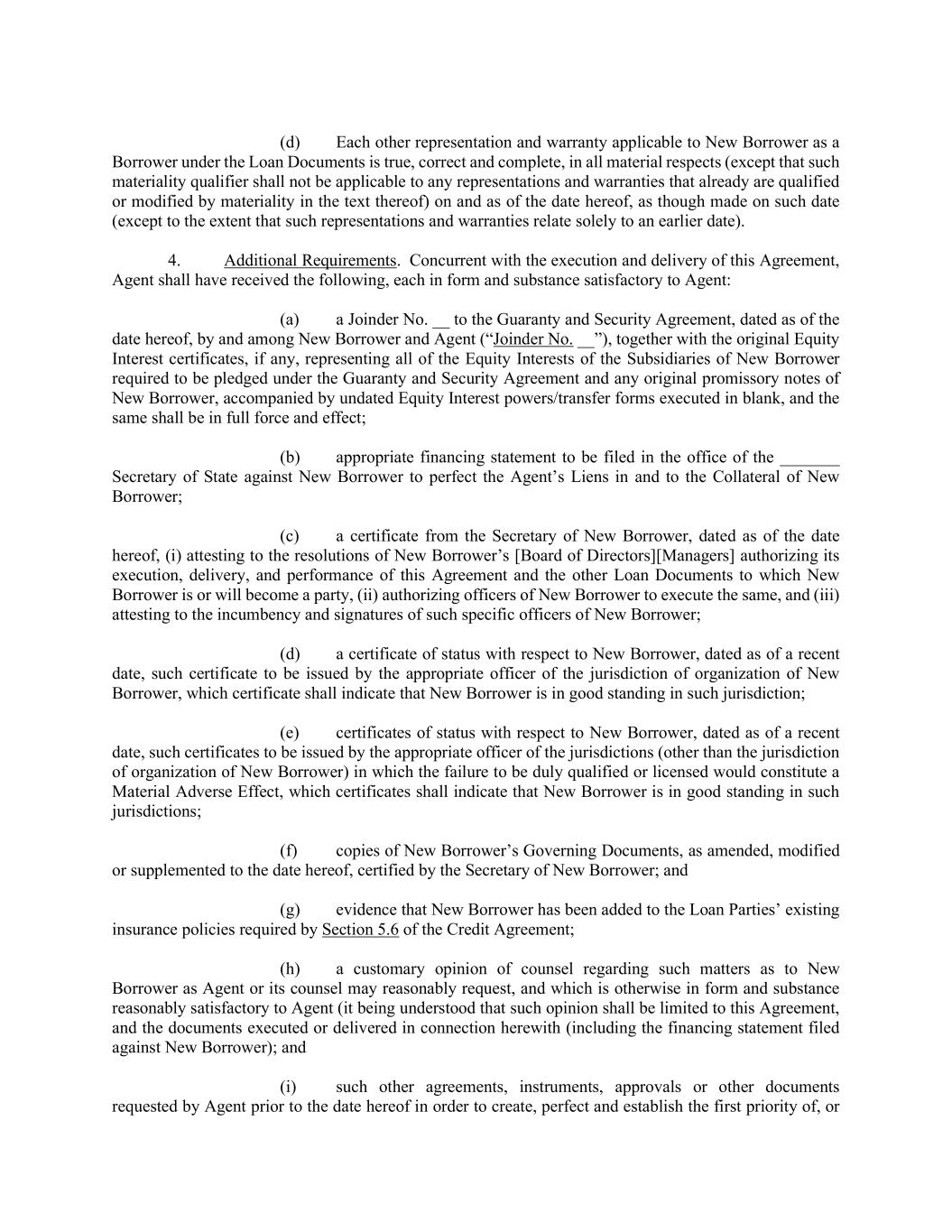 (d) Each other representation and warranty applicable to New Borrower as a Borrower under the Loan Documents is true, correct and complete, in all material respects (except that such materiality qualifier shall not be applicable to any representations and warranties that already are qualified or modified by materiality in the text thereof) on and as of the date hereof, as though made on such date (except to the extent that such representations and warranties relate solely to an earlier date). 4. Additional Requirements. Concurrent with the execution and delivery of this Agreement, Agent shall have received the following, each in form and substance satisfactory to Agent: (a) a Joinder No. __ to the Guaranty and Security Agreement, dated as of the date hereof, by and among New Borrower and Agent (“Joinder No. __”), together with the original Equity Interest certificates, if any, representing all of the Equity Interests of the Subsidiaries of New Borrower required to be pledged under the Guaranty and Security Agreement and any original promissory notes of New Borrower, accompanied by undated Equity Interest powers/transfer forms executed in blank, and the same shall be in full force and effect; (b) appropriate financing statement to be filed in the office of the _______ Secretary of State against New Borrower to perfect the Agent’s Liens in and to the Collateral of New Borrower; (c) a certificate from the Secretary of New Borrower, dated as of the date hereof, (i) attesting to the resolutions of New Borrower’s [Board of Directors][Managers] authorizing its execution, delivery, and performance of this Agreement and the other Loan Documents to which New Borrower is or will become a party, (ii) authorizing officers of New Borrower to execute the same, and (iii) attesting to the incumbency and signatures of such specific officers of New Borrower; (d) a certificate of status with respect to New Borrower, dated as of a recent date, such certificate to be issued by the appropriate officer of the jurisdiction of organization of New Borrower, which certificate shall indicate that New Borrower is in good standing in such jurisdiction; (e) certificates of status with respect to New Borrower, dated as of a recent date, such certificates to be issued by the appropriate officer of the jurisdictions (other than the jurisdiction of organization of New Borrower) in which the failure to be duly qualified or licensed would constitute a Material Adverse Effect, which certificates shall indicate that New Borrower is in good standing in such jurisdictions; (f) copies of New Borrower’s Governing Documents, as amended, modified or supplemented to the date hereof, certified by the Secretary of New Borrower; and (g) evidence that New Borrower has been added to the Loan Parties’ existing insurance policies required by Section 5.6 of the Credit Agreement; (h) a customary opinion of counsel regarding such matters as to New Borrower as Agent or its counsel may reasonably request, and which is otherwise in form and substance reasonably satisfactory to Agent (it being understood that such opinion shall be limited to this Agreement, and the documents executed or delivered in connection herewith (including the financing statement filed against New Borrower); and (i) such other agreements, instruments, approvals or other documents requested by Agent prior to the date hereof in order to create, perfect and establish the first priority of, or