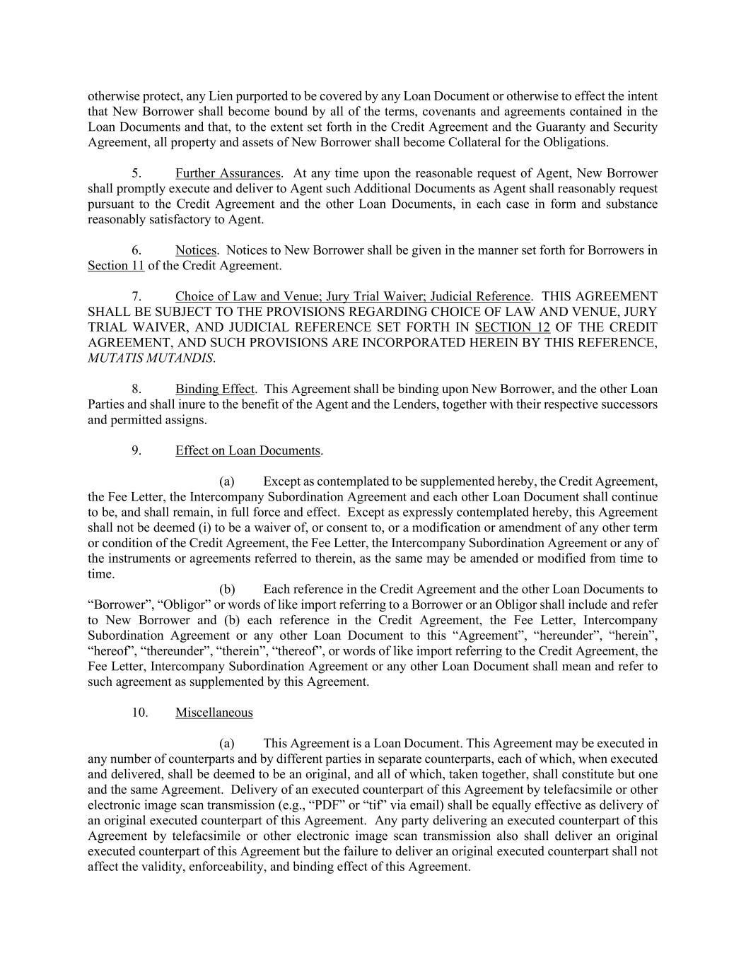 otherwise protect, any Lien purported to be covered by any Loan Document or otherwise to effect the intent that New Borrower shall become bound by all of the terms, covenants and agreements contained in the Loan Documents and that, to the extent set forth in the Credit Agreement and the Guaranty and Security Agreement, all property and assets of New Borrower shall become Collateral for the Obligations. 5. Further Assurances. At any time upon the reasonable request of Agent, New Borrower shall promptly execute and deliver to Agent such Additional Documents as Agent shall reasonably request pursuant to the Credit Agreement and the other Loan Documents, in each case in form and substance reasonably satisfactory to Agent. 6. Notices. Notices to New Borrower shall be given in the manner set forth for Borrowers in Section 11 of the Credit Agreement. 7. Choice of Law and Venue; Jury Trial Waiver; Judicial Reference. THIS AGREEMENT SHALL BE SUBJECT TO THE PROVISIONS REGARDING CHOICE OF LAW AND VENUE, JURY TRIAL WAIVER, AND JUDICIAL REFERENCE SET FORTH IN SECTION 12 OF THE CREDIT AGREEMENT, AND SUCH PROVISIONS ARE INCORPORATED HEREIN BY THIS REFERENCE, MUTATIS MUTANDIS. 8. Binding Effect. This Agreement shall be binding upon New Borrower, and the other Loan Parties and shall inure to the benefit of the Agent and the Lenders, together with their respective successors and permitted assigns. 9. Effect on Loan Documents. (a) Except as contemplated to be supplemented hereby, the Credit Agreement, the Fee Letter, the Intercompany Subordination Agreement and each other Loan Document shall continue to be, and shall remain, in full force and effect. Except as expressly contemplated hereby, this Agreement shall not be deemed (i) to be a waiver of, or consent to, or a modification or amendment of any other term or condition of the Credit Agreement, the Fee Letter, the Intercompany Subordination Agreement or any of the instruments or agreements referred to therein, as the same may be amended or modified from time to time. (b) Each reference in the Credit Agreement and the other Loan Documents to “Borrower”, “Obligor” or words of like import referring to a Borrower or an Obligor shall include and refer to New Borrower and (b) each reference in the Credit Agreement, the Fee Letter, Intercompany Subordination Agreement or any other Loan Document to this “Agreement”, “hereunder”, “herein”, “hereof”, “thereunder”, “therein”, “thereof”, or words of like import referring to the Credit Agreement, the Fee Letter, Intercompany Subordination Agreement or any other Loan Document shall mean and refer to such agreement as supplemented by this Agreement. 10. Miscellaneous (a) This Agreement is a Loan Document. This Agreement may be executed in any number of counterparts and by different parties in separate counterparts, each of which, when executed and delivered, shall be deemed to be an original, and all of which, taken together, shall constitute but one and the same Agreement. Delivery of an executed counterpart of this Agreement by telefacsimile or other electronic image scan transmission (e.g., “PDF” or “tif” via email) shall be equally effective as delivery of an original executed counterpart of this Agreement. Any party delivering an executed counterpart of this Agreement by telefacsimile or other electronic image scan transmission also shall deliver an original executed counterpart of this Agreement but the failure to deliver an original executed counterpart shall not affect the validity, enforceability, and binding effect of this Agreement.