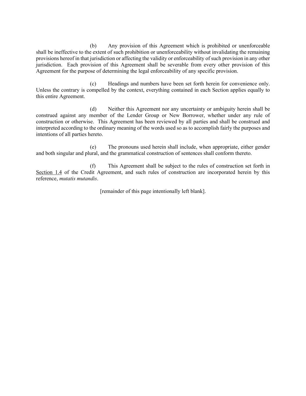 (b) Any provision of this Agreement which is prohibited or unenforceable shall be ineffective to the extent of such prohibition or unenforceability without invalidating the remaining provisions hereof in that jurisdiction or affecting the validity or enforceability of such provision in any other jurisdiction. Each provision of this Agreement shall be severable from every other provision of this Agreement for the purpose of determining the legal enforceability of any specific provision. (c) Headings and numbers have been set forth herein for convenience only. Unless the contrary is compelled by the context, everything contained in each Section applies equally to this entire Agreement. (d) Neither this Agreement nor any uncertainty or ambiguity herein shall be construed against any member of the Lender Group or New Borrower, whether under any rule of construction or otherwise. This Agreement has been reviewed by all parties and shall be construed and interpreted according to the ordinary meaning of the words used so as to accomplish fairly the purposes and intentions of all parties hereto. (e) The pronouns used herein shall include, when appropriate, either gender and both singular and plural, and the grammatical construction of sentences shall conform thereto. (f) This Agreement shall be subject to the rules of construction set forth in Section 1.4 of the Credit Agreement, and such rules of construction are incorporated herein by this reference, mutatis mutandis. [remainder of this page intentionally left blank].