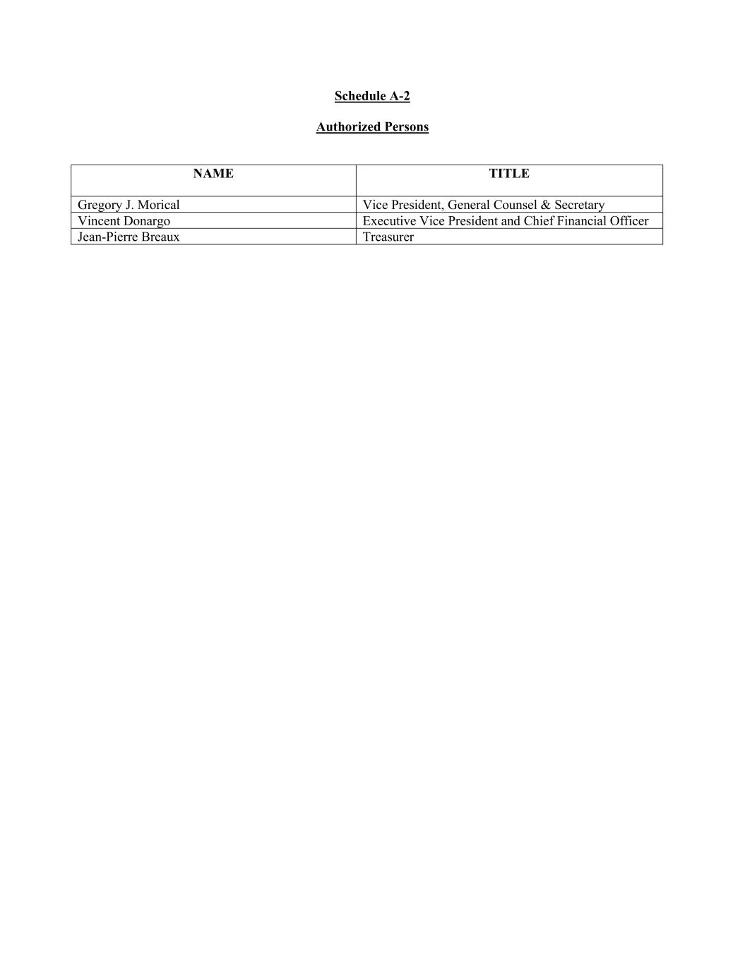 Schedule A-2 Authorized Persons NAME TITLE Gregory J. Morical Vice President, General Counsel & Secretary Vincent Donargo Executive Vice President and Chief Financial Officer Jean-Pierre Breaux Treasurer