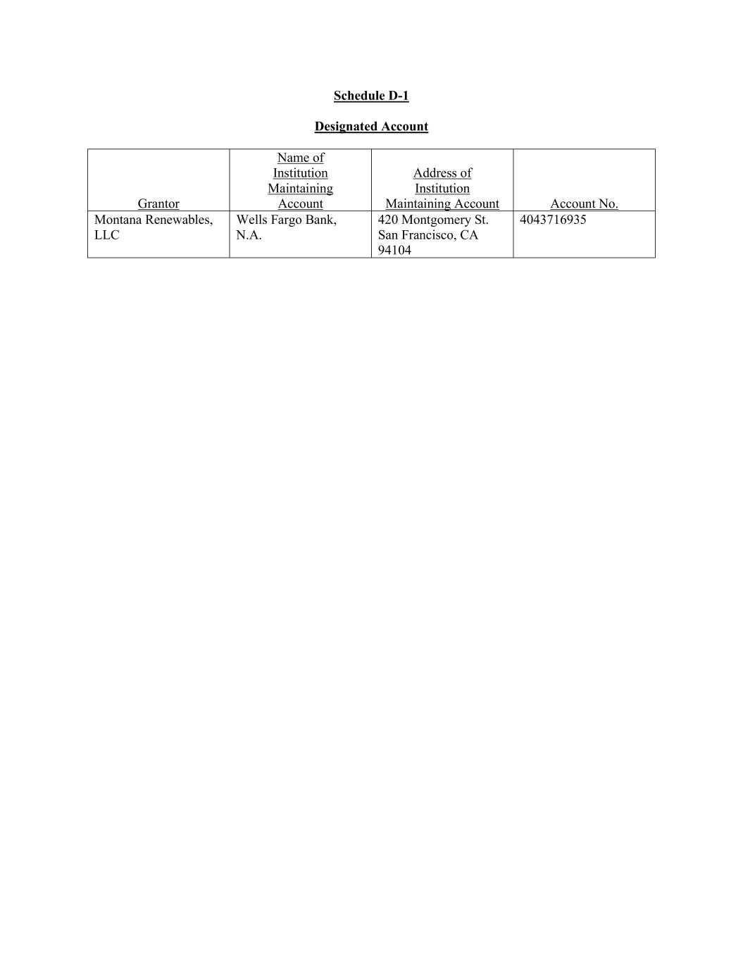 Schedule D-1 Designated Account Grantor Name of Institution Maintaining Account Address of Institution Maintaining Account Account No. Montana Renewables, LLC Wells Fargo Bank, N.A. 420 Montgomery St. San Francisco, CA 94104 4043716935