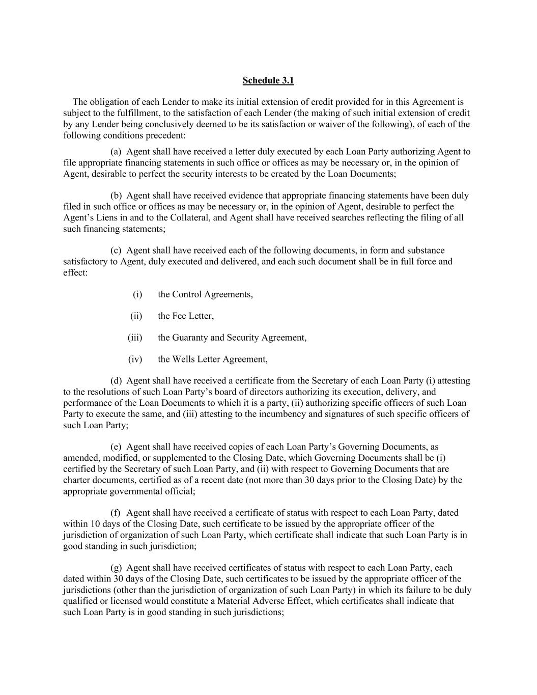 Schedule 3.1 The obligation of each Lender to make its initial extension of credit provided for in this Agreement is subject to the fulfillment, to the satisfaction of each Lender (the making of such initial extension of credit by any Lender being conclusively deemed to be its satisfaction or waiver of the following), of each of the following conditions precedent: (a) Agent shall have received a letter duly executed by each Loan Party authorizing Agent to file appropriate financing statements in such office or offices as may be necessary or, in the opinion of Agent, desirable to perfect the security interests to be created by the Loan Documents; (b) Agent shall have received evidence that appropriate financing statements have been duly filed in such office or offices as may be necessary or, in the opinion of Agent, desirable to perfect the Agent’s Liens in and to the Collateral, and Agent shall have received searches reflecting the filing of all such financing statements; (c) Agent shall have received each of the following documents, in form and substance satisfactory to Agent, duly executed and delivered, and each such document shall be in full force and effect: (i) the Control Agreements, (ii) the Fee Letter, (iii) the Guaranty and Security Agreement, (iv) the Wells Letter Agreement, (d) Agent shall have received a certificate from the Secretary of each Loan Party (i) attesting to the resolutions of such Loan Party’s board of directors authorizing its execution, delivery, and performance of the Loan Documents to which it is a party, (ii) authorizing specific officers of such Loan Party to execute the same, and (iii) attesting to the incumbency and signatures of such specific officers of such Loan Party; (e) Agent shall have received copies of each Loan Party’s Governing Documents, as amended, modified, or supplemented to the Closing Date, which Governing Documents shall be (i) certified by the Secretary of such Loan Party, and (ii) with respect to Governing Documents that are charter documents, certified as of a recent date (not more than 30 days prior to the Closing Date) by the appropriate governmental official; (f) Agent shall have received a certificate of status with respect to each Loan Party, dated within 10 days of the Closing Date, such certificate to be issued by the appropriate officer of the jurisdiction of organization of such Loan Party, which certificate shall indicate that such Loan Party is in good standing in such jurisdiction; (g) Agent shall have received certificates of status with respect to each Loan Party, each dated within 30 days of the Closing Date, such certificates to be issued by the appropriate officer of the jurisdictions (other than the jurisdiction of organization of such Loan Party) in which its failure to be duly qualified or licensed would constitute a Material Adverse Effect, which certificates shall indicate that such Loan Party is in good standing in such jurisdictions;