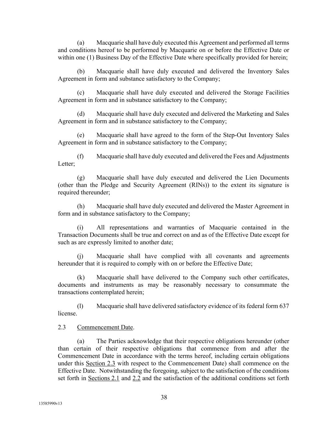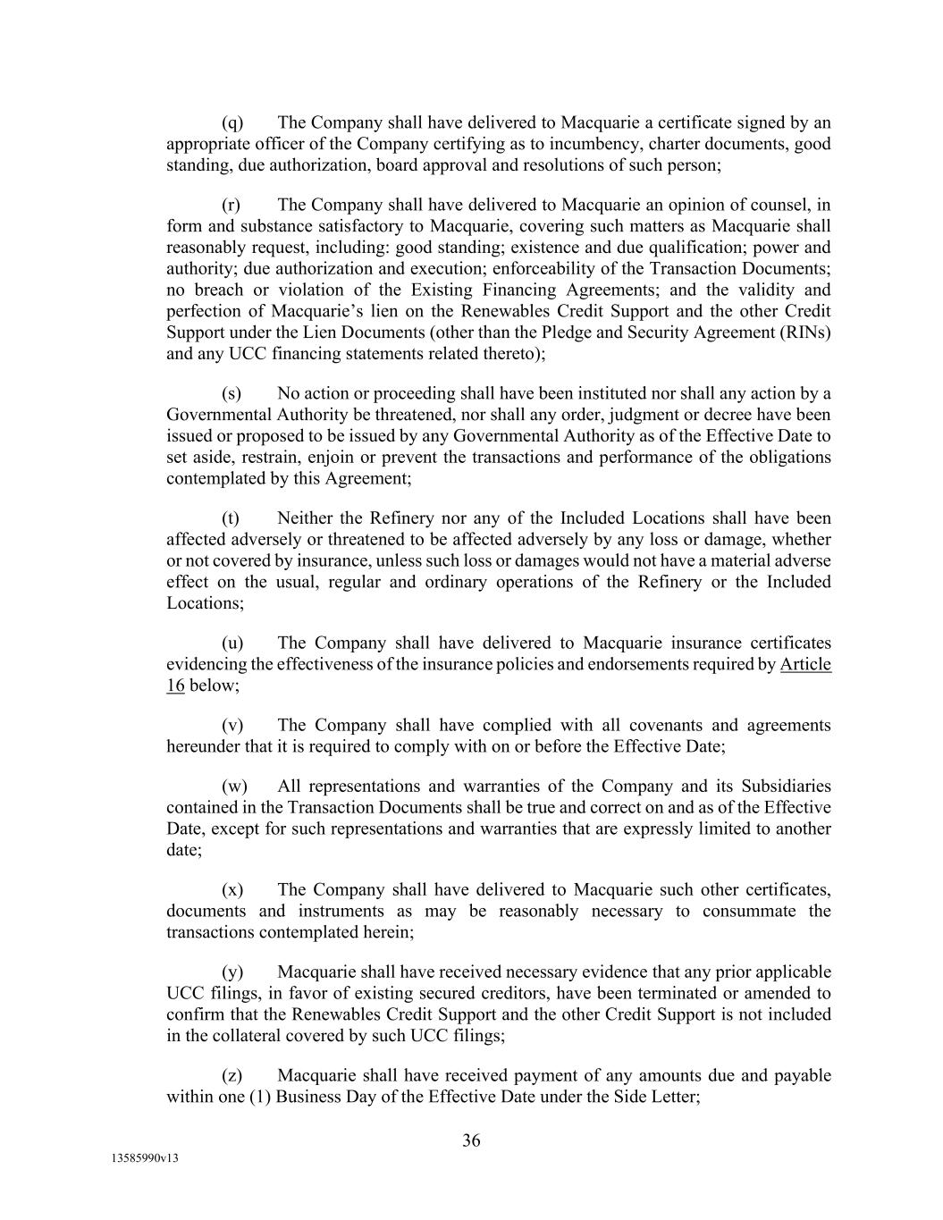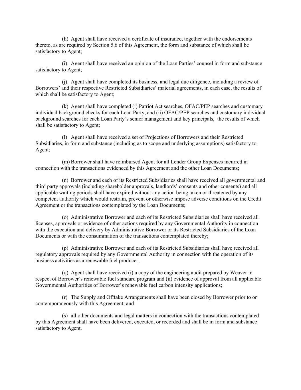 (h) Agent shall have received a certificate of insurance, together with the endorsements thereto, as are required by Section 5.6 of this Agreement, the form and substance of which shall be satisfactory to Agent; (i) Agent shall have received an opinion of the Loan Parties’ counsel in form and substance satisfactory to Agent; (j) Agent shall have completed its business, and legal due diligence, including a review of Borrowers’ and their respective Restricted Subsidiaries’ material agreements, in each case, the results of which shall be satisfactory to Agent; (k) Agent shall have completed (i) Patriot Act searches, OFAC/PEP searches and customary individual background checks for each Loan Party, and (ii) OFAC/PEP searches and customary individual background searches for each Loan Party’s senior management and key principals, the results of which shall be satisfactory to Agent; (l) Agent shall have received a set of Projections of Borrowers and their Restricted Subsidiaries, in form and substance (including as to scope and underlying assumptions) satisfactory to Agent; (m) Borrower shall have reimbursed Agent for all Lender Group Expenses incurred in connection with the transactions evidenced by this Agreement and the other Loan Documents; (n) Borrower and each of its Restricted Subsidiaries shall have received all governmental and third party approvals (including shareholder approvals, landlords’ consents and other consents) and all applicable waiting periods shall have expired without any action being taken or threatened by any competent authority which would restrain, prevent or otherwise impose adverse conditions on the Credit Agreement or the transactions contemplated by the Loan Documents; (o) Administrative Borrower and each of its Restricted Subsidiaries shall have received all licenses, approvals or evidence of other actions required by any Governmental Authority in connection with the execution and delivery by Administrative Borrower or its Restricted Subsidiaries of the Loan Documents or with the consummation of the transactions contemplated thereby; (p) Administrative Borrower and each of its Restricted Subsidiaries shall have received all regulatory approvals required by any Governmental Authority in connection with the operation of its business activities as a renewable fuel producer; (q) Agent shall have received (i) a copy of the engineering audit prepared by Weaver in respect of Borrower’s renewable fuel standard program and (ii) evidence of approval from all applicable Governmental Authorities of Borrower’s renewable fuel carbon intensity applications; (r) The Supply and Offtake Arrangements shall have been closed by Borrower prior to or contemporaneously with this Agreement; and (s) all other documents and legal matters in connection with the transactions contemplated by this Agreement shall have been delivered, executed, or recorded and shall be in form and substance satisfactory to Agent.