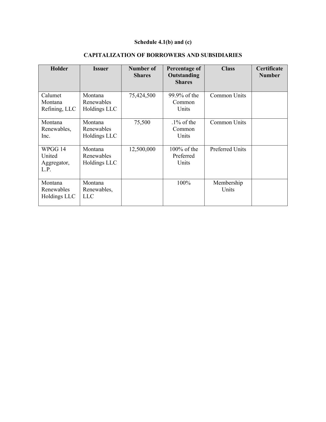 Schedule 4.1(b) and (c) CAPITALIZATION OF BORROWERS AND SUBSIDIARIES Holder Issuer Number of Shares Percentage of Outstanding Shares Class Certificate Number Calumet Montana Refining, LLC Montana Renewables Holdings LLC 75,424,500 99.9% of the Common Units Common Units Montana Renewables, Inc. Montana Renewables Holdings LLC 75,500 .1% of the Common Units Common Units WPGG 14 United Aggregator, L.P. Montana Renewables Holdings LLC 12,500,000 100% of the Preferred Units Preferred Units Montana Renewables Holdings LLC Montana Renewables, LLC 100% Membership Units