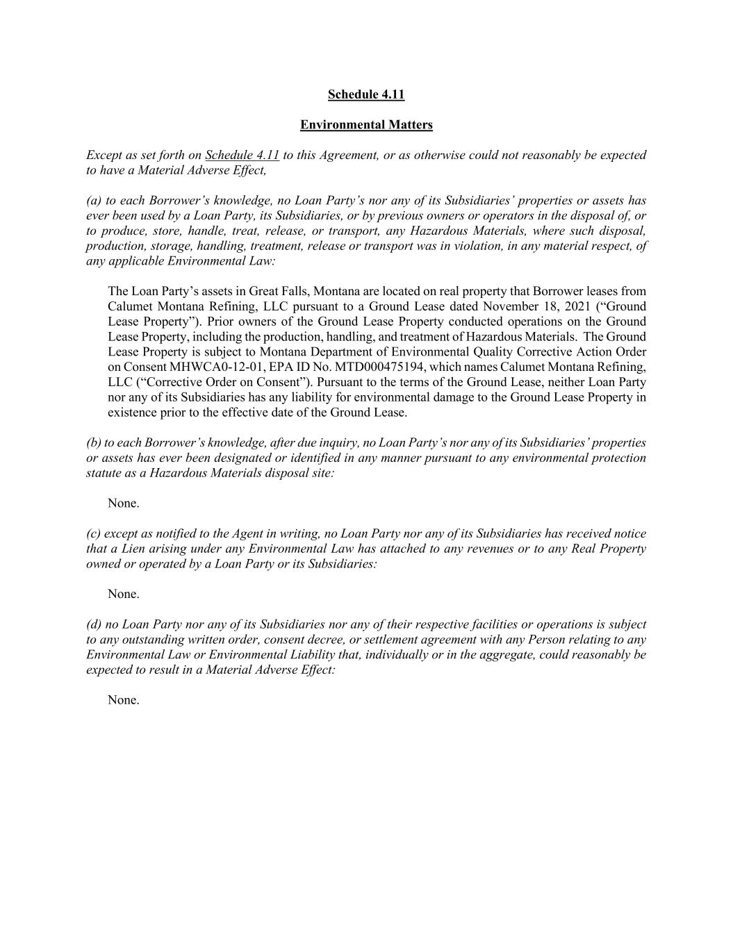 Schedule 4.11 Environmental Matters Except as set forth on Schedule 4.11 to this Agreement, or as otherwise could not reasonably be expected to have a Material Adverse Effect, (a) to each Borrower’s knowledge, no Loan Party’s nor any of its Subsidiaries’ properties or assets has ever been used by a Loan Party, its Subsidiaries, or by previous owners or operators in the disposal of, or to produce, store, handle, treat, release, or transport, any Hazardous Materials, where such disposal, production, storage, handling, treatment, release or transport was in violation, in any material respect, of any applicable Environmental Law: The Loan Party’s assets in Great Falls, Montana are located on real property that Borrower leases from Calumet Montana Refining, LLC pursuant to a Ground Lease dated November 18, 2021 (“Ground Lease Property”). Prior owners of the Ground Lease Property conducted operations on the Ground Lease Property, including the production, handling, and treatment of Hazardous Materials. The Ground Lease Property is subject to Montana Department of Environmental Quality Corrective Action Order on Consent MHWCA0-12-01, EPA ID No. MTD000475194, which names Calumet Montana Refining, LLC (“Corrective Order on Consent”). Pursuant to the terms of the Ground Lease, neither Loan Party nor any of its Subsidiaries has any liability for environmental damage to the Ground Lease Property in existence prior to the effective date of the Ground Lease. (b) to each Borrower’s knowledge, after due inquiry, no Loan Party’s nor any of its Subsidiaries’ properties or assets has ever been designated or identified in any manner pursuant to any environmental protection statute as a Hazardous Materials disposal site: None. (c) except as notified to the Agent in writing, no Loan Party nor any of its Subsidiaries has received notice that a Lien arising under any Environmental Law has attached to any revenues or to any Real Property owned or operated by a Loan Party or its Subsidiaries: None. (d) no Loan Party nor any of its Subsidiaries nor any of their respective facilities or operations is subject to any outstanding written order, consent decree, or settlement agreement with any Person relating to any Environmental Law or Environmental Liability that, individually or in the aggregate, could reasonably be expected to result in a Material Adverse Effect: None.