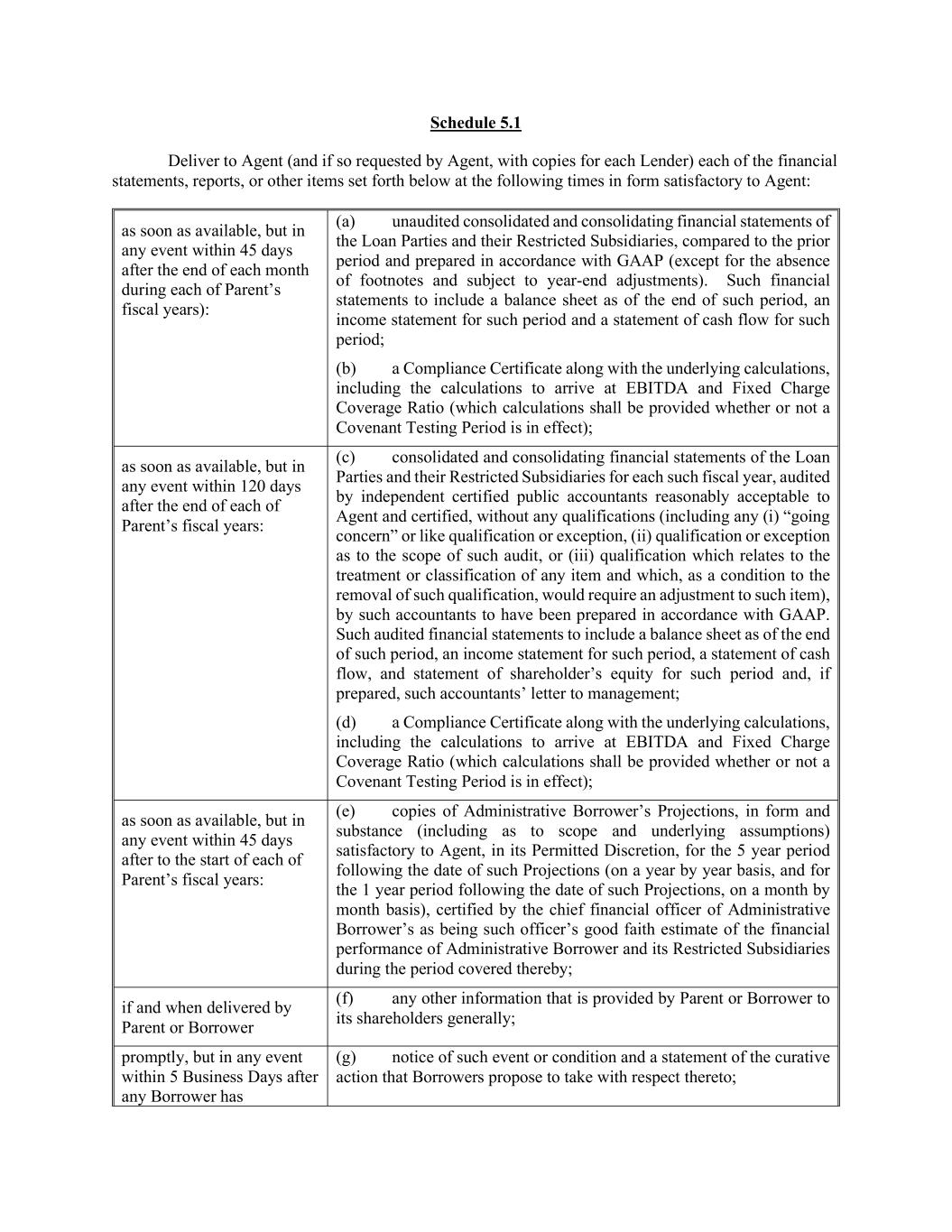 Schedule 5.1 Deliver to Agent (and if so requested by Agent, with copies for each Lender) each of the financial statements, reports, or other items set forth below at the following times in form satisfactory to Agent: as soon as available, but in any event within 45 days after the end of each month during each of Parent’s fiscal years): (a) unaudited consolidated and consolidating financial statements of the Loan Parties and their Restricted Subsidiaries, compared to the prior period and prepared in accordance with GAAP (except for the absence of footnotes and subject to year-end adjustments). Such financial statements to include a balance sheet as of the end of such period, an income statement for such period and a statement of cash flow for such period; (b) a Compliance Certificate along with the underlying calculations, including the calculations to arrive at EBITDA and Fixed Charge Coverage Ratio (which calculations shall be provided whether or not a Covenant Testing Period is in effect); as soon as available, but in any event within 120 days after the end of each of Parent’s fiscal years: (c) consolidated and consolidating financial statements of the Loan Parties and their Restricted Subsidiaries for each such fiscal year, audited by independent certified public accountants reasonably acceptable to Agent and certified, without any qualifications (including any (i) “going concern” or like qualification or exception, (ii) qualification or exception as to the scope of such audit, or (iii) qualification which relates to the treatment or classification of any item and which, as a condition to the removal of such qualification, would require an adjustment to such item), by such accountants to have been prepared in accordance with GAAP. Such audited financial statements to include a balance sheet as of the end of such period, an income statement for such period, a statement of cash flow, and statement of shareholder’s equity for such period and, if prepared, such accountants’ letter to management; (d) a Compliance Certificate along with the underlying calculations, including the calculations to arrive at EBITDA and Fixed Charge Coverage Ratio (which calculations shall be provided whether or not a Covenant Testing Period is in effect); as soon as available, but in any event within 45 days after to the start of each of Parent’s fiscal years: (e) copies of Administrative Borrower’s Projections, in form and substance (including as to scope and underlying assumptions) satisfactory to Agent, in its Permitted Discretion, for the 5 year period following the date of such Projections (on a year by year basis, and for the 1 year period following the date of such Projections, on a month by month basis), certified by the chief financial officer of Administrative Borrower’s as being such officer’s good faith estimate of the financial performance of Administrative Borrower and its Restricted Subsidiaries during the period covered thereby; if and when delivered by Parent or Borrower (f) any other information that is provided by Parent or Borrower to its shareholders generally; promptly, but in any event within 5 Business Days after any Borrower has (g) notice of such event or condition and a statement of the curative action that Borrowers propose to take with respect thereto;