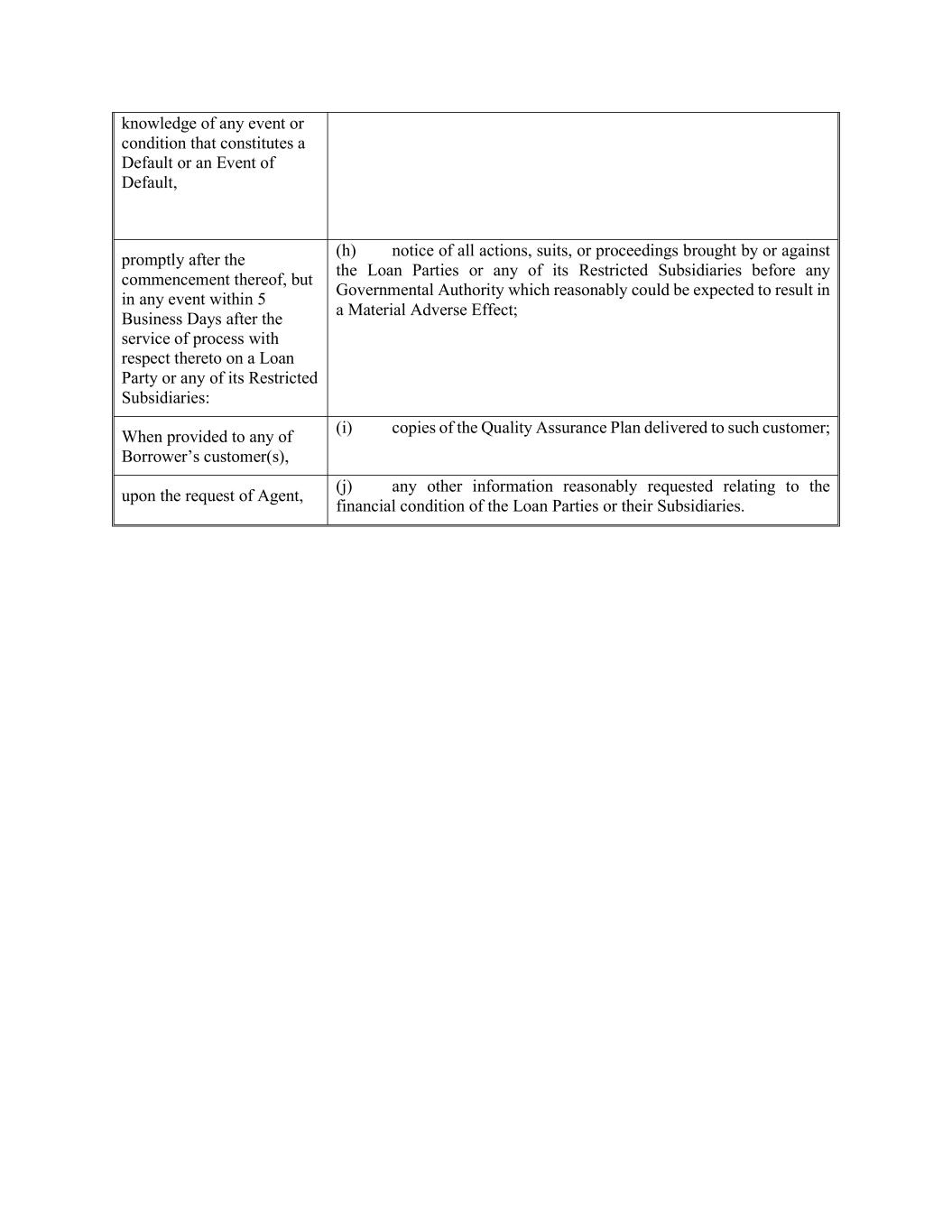 knowledge of any event or condition that constitutes a Default or an Event of Default, promptly after the commencement thereof, but in any event within 5 Business Days after the service of process with respect thereto on a Loan Party or any of its Restricted Subsidiaries: (h) notice of all actions, suits, or proceedings brought by or against the Loan Parties or any of its Restricted Subsidiaries before any Governmental Authority which reasonably could be expected to result in a Material Adverse Effect; When provided to any of Borrower’s customer(s), (i) copies of the Quality Assurance Plan delivered to such customer; upon the request of Agent, (j) any other information reasonably requested relating to the financial condition of the Loan Parties or their Subsidiaries.