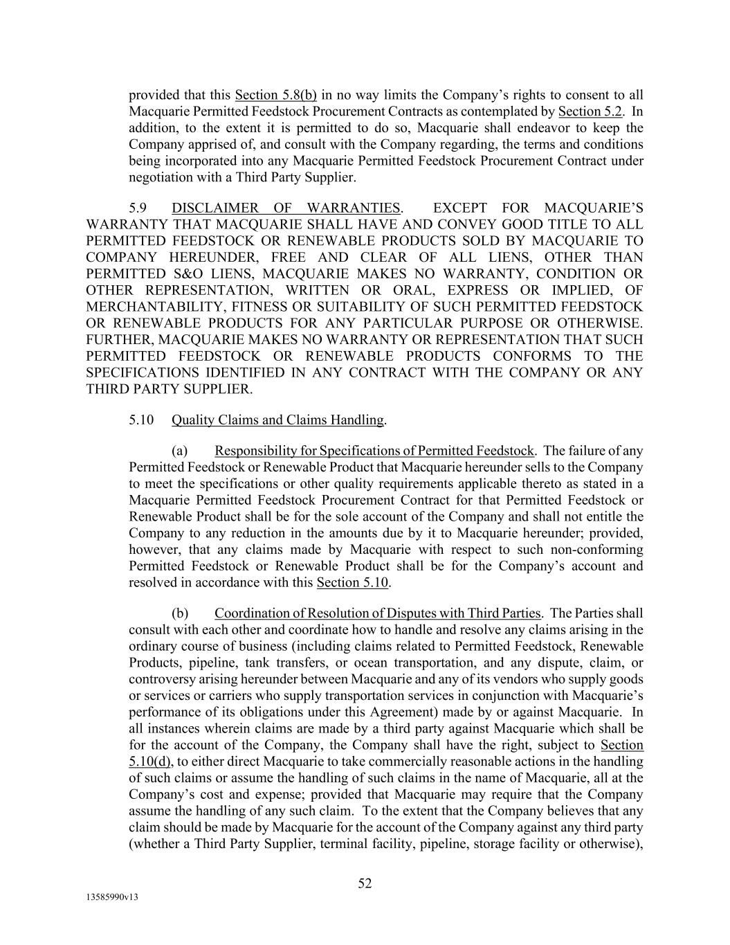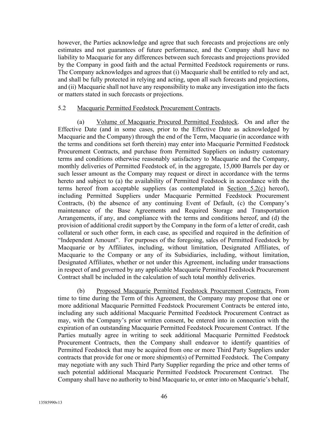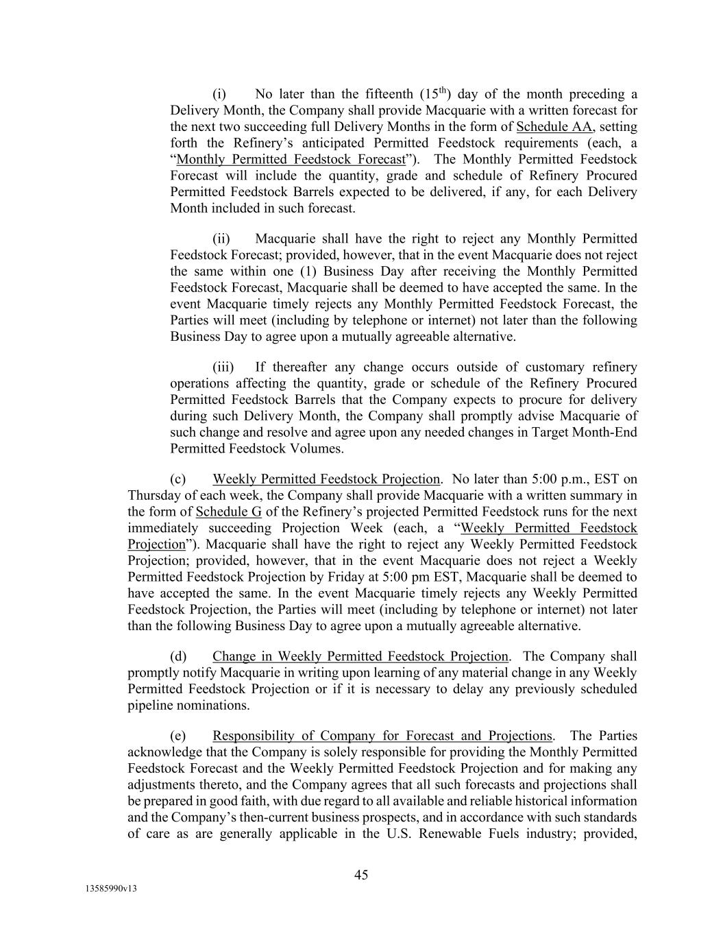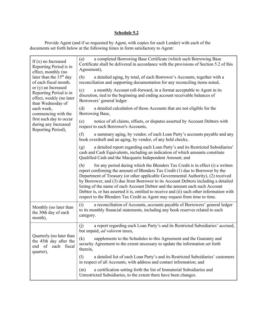 Schedule 5.2 Provide Agent (and if so requested by Agent, with copies for each Lender) with each of the documents set forth below at the following times in form satisfactory to Agent: If (x) no Increased Reporting Period is in effect, monthly (no later than the 15th day of each fiscal month, or (y) an Increased Reporting Period is in effect, weekly (no later than Wednesday of each week, commencing with the first such day to occur during any Increased Reporting Period), (a) a completed Borrowing Base Certificate (which such Borrowing Base Certificate shall be delivered in accordance with the provisions of Section 5.2 of this Agreement), (b) a detailed aging, by total, of each Borrower’s Accounts, together with a reconciliation and supporting documentation for any reconciling items noted, (c) a monthly Account roll-forward, in a format acceptable to Agent in its discretion, tied to the beginning and ending account receivable balances of Borrowers’ general ledger (d) a detailed calculation of those Accounts that are not eligible for the Borrowing Base, (e) notice of all claims, offsets, or disputes asserted by Account Debtors with respect to each Borrower's Accounts, (f) a summary aging, by vendor, of each Loan Party’s accounts payable and any book overdraft and an aging, by vendor, of any held checks, (g) a detailed report regarding each Loan Party’s and its Restricted Subsidiaries' cash and Cash Equivalents, including an indication of which amounts constitute Qualified Cash and the Macquarie Independent Amount; and (h) for any period during which the Blenders Tax Credit is in effect (i) a written report confirming the amount of Blenders Tax Credit (1) due to Borrower by the Department of Treasury (or other applicable Governmental Authority), (2) received by Borrower, and (3) due from Borrower to its Account Debtors including a detailed listing of the name of each Account Debtor and the amount each such Account Debtor is, or has asserted it is, entitled to receive and (ii) such other information with respect to the Blenders Tax Credit as Agent may request from time to time. Monthly (no later than the 30th day of each month), (i) a reconciliation of Accounts, accounts payable of Borrowers’ general ledger to its monthly financial statements, including any book reserves related to each category. Quarterly (no later than the 45th day after the end of each fiscal quarter), (j) a report regarding each Loan Party’s and its Restricted Subsidiaries’ accrued, but unpaid, ad valorem taxes, (k) supplements to the Schedules to this Agreement and the Guaranty and security Agreement to the extent necessary to update the information set forth therein, (l) a detailed list of each Loan Party’s and its Restricted Subsidiaries’ customers in respect of all Accounts, with address and contact information; and (m) a certification setting forth the list of Immaterial Subsidiaries and Unrestricted Subsidiaries, to the extent there have been changes.
