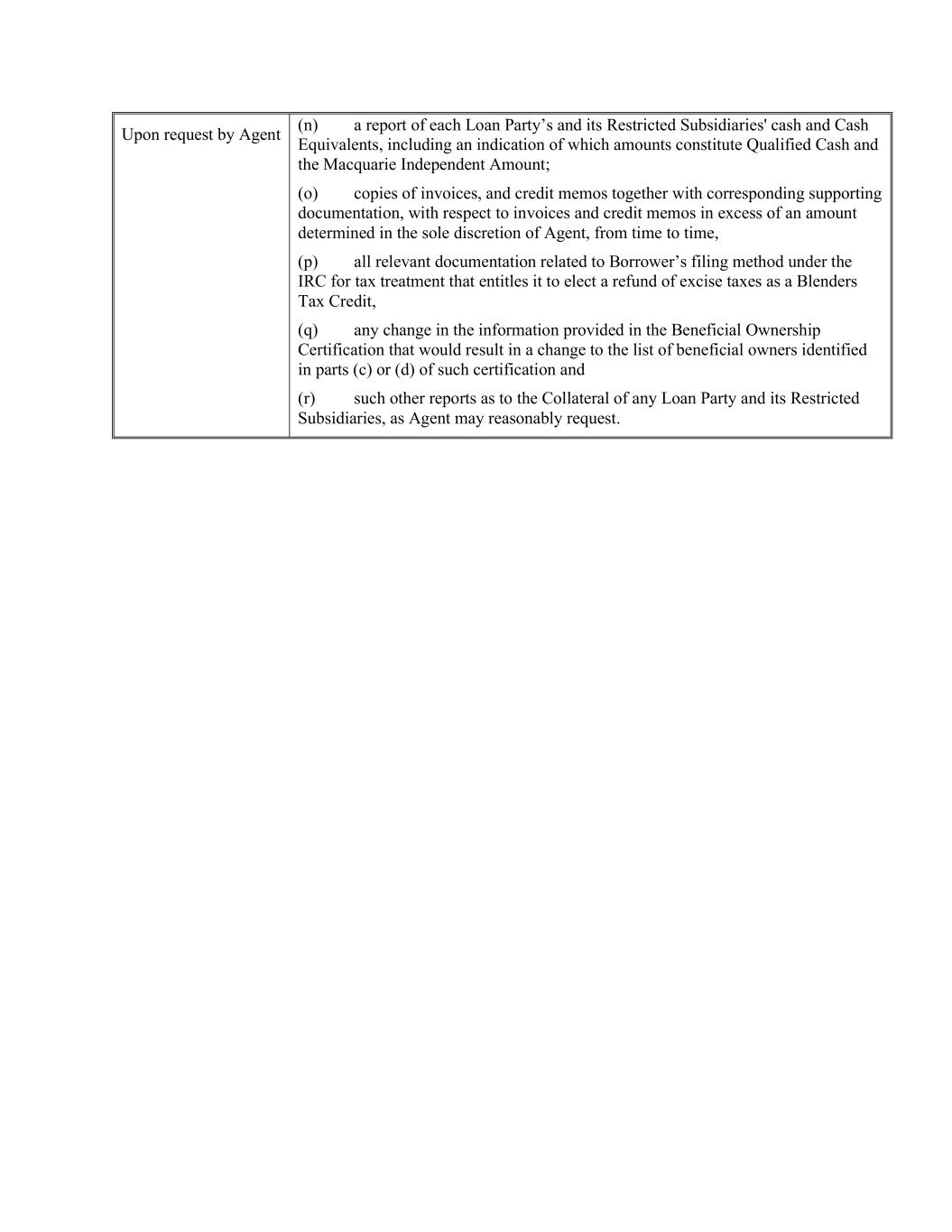 Upon request by Agent (n) a report of each Loan Party’s and its Restricted Subsidiaries' cash and Cash Equivalents, including an indication of which amounts constitute Qualified Cash and the Macquarie Independent Amount; (o) copies of invoices, and credit memos together with corresponding supporting documentation, with respect to invoices and credit memos in excess of an amount determined in the sole discretion of Agent, from time to time, (p) all relevant documentation related to Borrower’s filing method under the IRC for tax treatment that entitles it to elect a refund of excise taxes as a Blenders Tax Credit, (q) any change in the information provided in the Beneficial Ownership Certification that would result in a change to the list of beneficial owners identified in parts (c) or (d) of such certification and (r) such other reports as to the Collateral of any Loan Party and its Restricted Subsidiaries, as Agent may reasonably request.