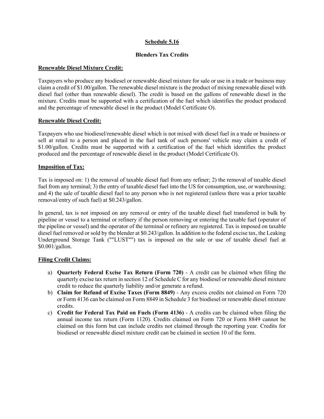 Schedule 5.16 Blenders Tax Credits Renewable Diesel Mixture Credit: Taxpayers who produce any biodiesel or renewable diesel mixture for sale or use in a trade or business may claim a credit of $1.00/gallon. The renewable diesel mixture is the product of mixing renewable diesel with diesel fuel (other than renewable diesel). The credit is based on the gallons of renewable diesel in the mixture. Credits must be supported with a certification of the fuel which identifies the product produced and the percentage of renewable diesel in the product (Model Certificate O). Renewable Diesel Credit: Taxpayers who use biodiesel/renewable diesel which is not mixed with diesel fuel in a trade or business or sell at retail to a person and placed in the fuel tank of such persons' vehicle may claim a credit of $1.00/gallon. Credits must be supported with a certification of the fuel which identifies the product produced and the percentage of renewable diesel in the product (Model Certificate O). Imposition of Tax: Tax is imposed on: 1) the removal of taxable diesel fuel from any refiner; 2) the removal of taxable diesel fuel from any terminal; 3) the entry of taxable diesel fuel into the US for consumption, use, or warehousing; and 4) the sale of taxable diesel fuel to any person who is not registered (unless there was a prior taxable removal/entry of such fuel) at $0.243/gallon. In general, tax is not imposed on any removal or entry of the taxable diesel fuel transferred in bulk by pipeline or vessel to a terminal or refinery if the person removing or entering the taxable fuel (operator of the pipeline or vessel) and the operator of the terminal or refinery are registered. Tax is imposed on taxable diesel fuel removed or sold by the blender at $0.243/gallon. In addition to the federal excise tax, the Leaking Underground Storage Tank (""LUST"") tax is imposed on the sale or use of taxable diesel fuel at $0.001/gallon. Filing Credit Claims: a) Quarterly Federal Excise Tax Return (Form 720) - A credit can be claimed when filing the quarterly excise tax return in section 12 of Schedule C for any biodiesel or renewable diesel mixture credit to reduce the quarterly liability and/or generate a refund. b) Claim for Refund of Excise Taxes (Form 8849) - Any excess credits not claimed on Form 720 or Form 4136 can be claimed on Form 8849 in Schedule 3 for biodiesel or renewable diesel mixture credits. c) Credit for Federal Tax Paid on Fuels (Form 4136) - A credits can be claimed when filing the annual income tax return (Form 1120). Credits claimed on Form 720 or Form 8849 cannot be claimed on this form but can include credits not claimed through the reporting year. Credits for biodiesel or renewable diesel mixture credit can be claimed in section 10 of the form.