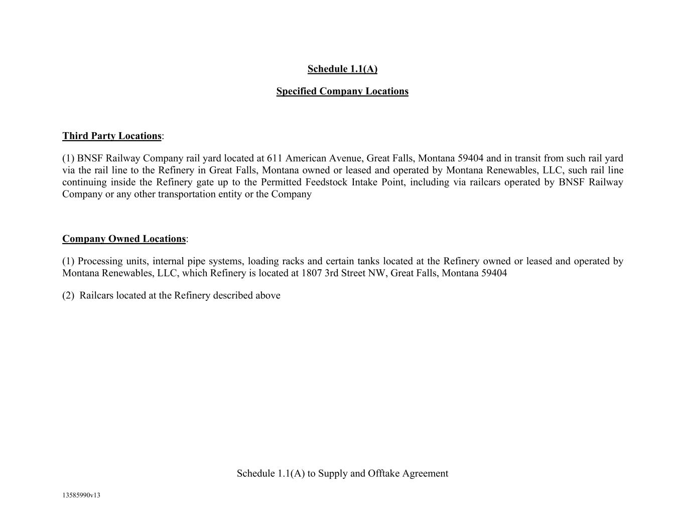 Schedule A-1 Agent’s Account Bank: Wells Fargo Bank, N.A. Bank Address: 420 Montgomery Street, San Francisco, CA 94104 ABA: 121-000-248 Account Name: Wells Fargo Bank, N.A. Account Number: 37235547964505773 Reference: Montana Renewables, LLC