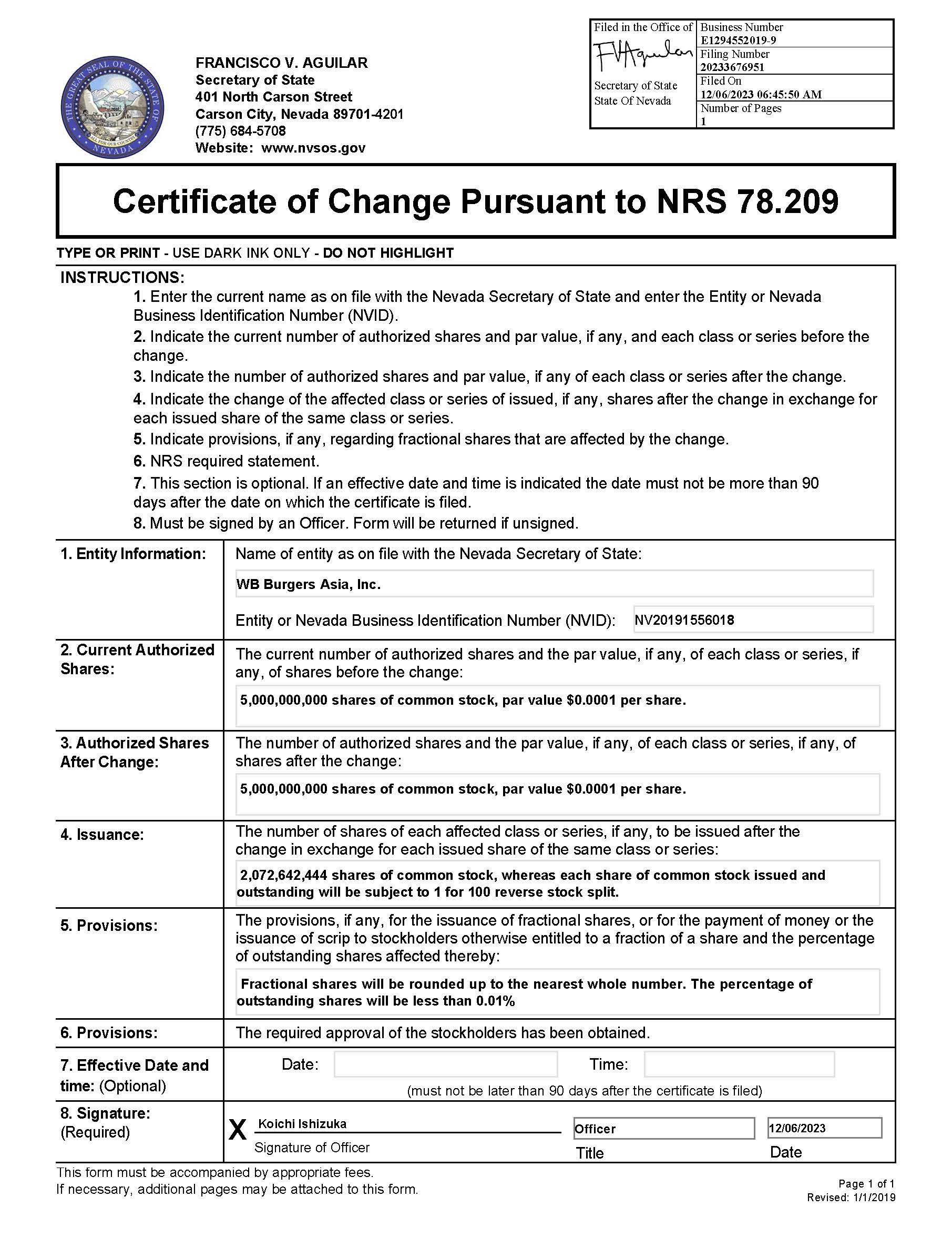 The Reverse Stock Split has been effected by the Company filing a Certificate of Change (the “Certificate”) pursuant to Nevada Revised Statutes (“NRS”) Section 78.209 with the Nevada Secretary of State on December 6, 2023.