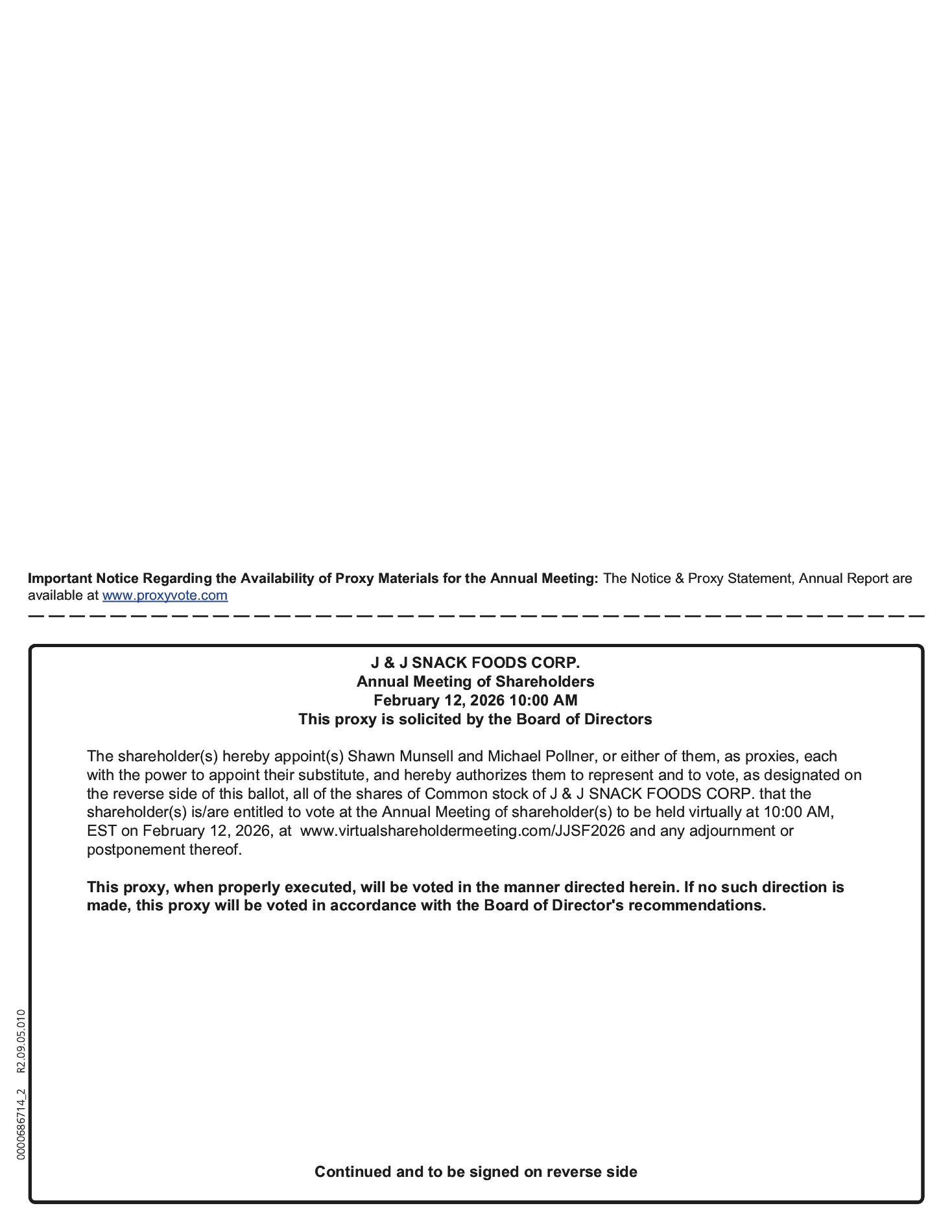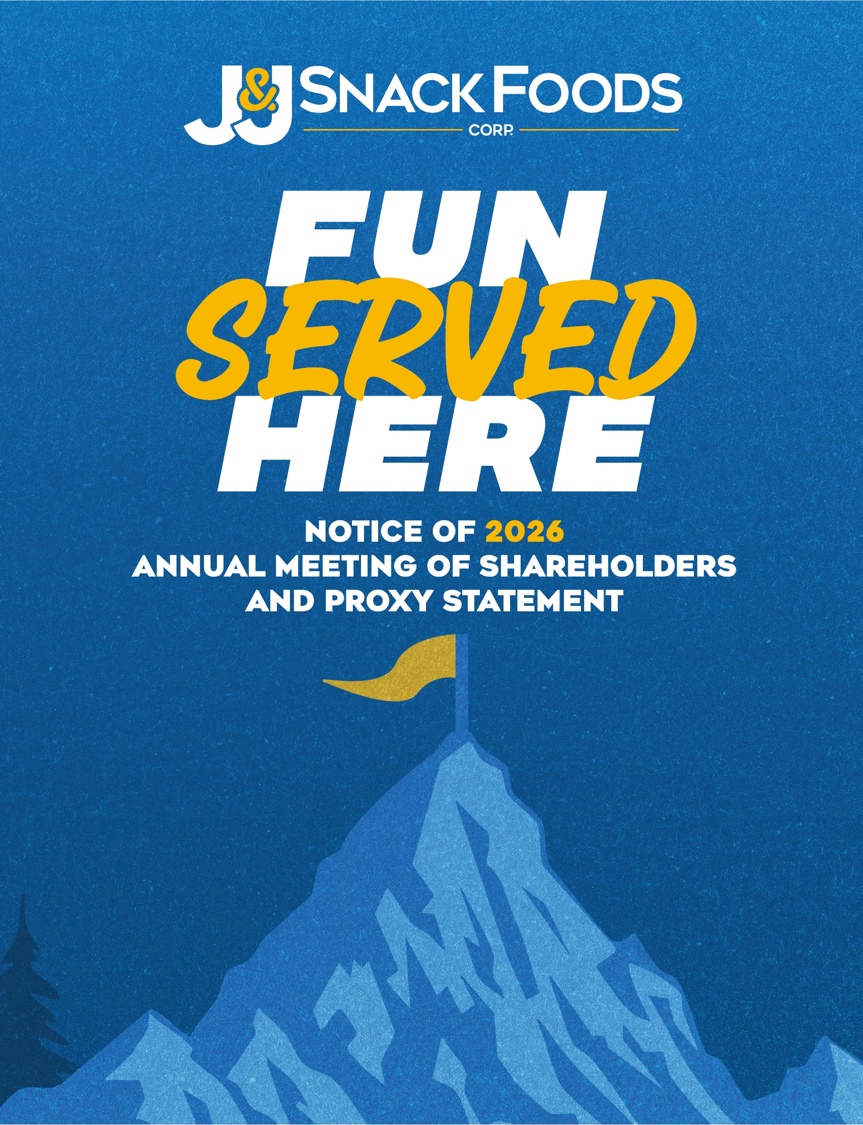 We are pleased to invite you to the 2026 Annual Meeting of Shareholders (the “Annual Meeting”) of J & J SNACK FOODS CORP. (“J & J,” the “Company,” “our,” “us” or “we”), which will be held virtually on Thursday, February 12, 2026, at 10:00 A.M., Eastern Time, for the following purposes: