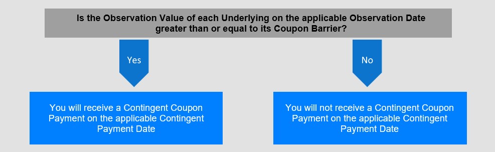 If, on any monthly Observation Date, the Observation Value of each Underlying is greater than or equal to its Coupon Barrier, we will pay a Contingent Coupon Payment of $8.375 per $1,000.00 in principal amount of Notes (equal to a rate of 0.8375% per month or 10.05% per annum) on the applicable Contingent Payment Date (including the Maturity Date).