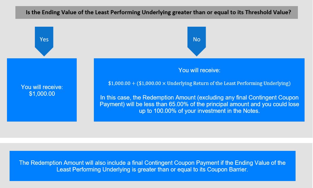 The Redemption Amount will also include a final Contingent Coupon Payment if the Ending Value of the Least Performing Underlying is greater than or equal to its Coupon Barrier.