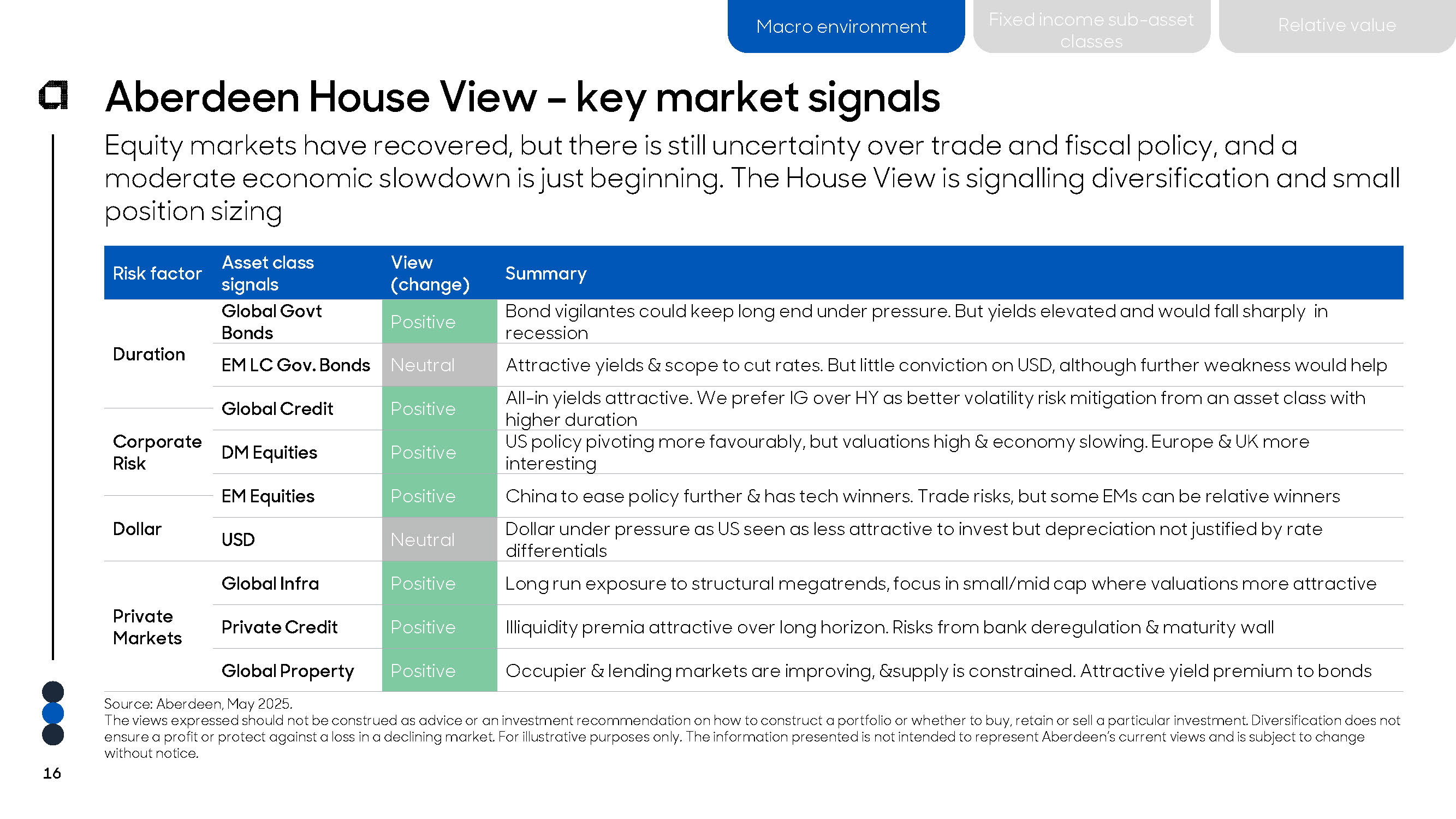 Macro environment Fixed income sub-asset classes Relative value Aberdeen House View The House View brings together our investment expertise from across asset classes and research teams into a consistent framework. It sends high level signals on key markets over the next 12 to 18 months. Source: Aberdeen. Bringing together the collective knowledge and expertise across Aberdeen Research insights Common framework Key signals & judgements • Investment inputs from all asset classes • Economic inputs from Global Macro Research • ESG inputs from Sustainability • CIO-led, bringing in expertise from across the business • Commissions collaborative, crossasset research • Performance and views tracked • Key judgements on the macro and micro drivers of markets • Clear signals on the major asset classes • Firm-wide communication of views “Reflect, rationale, feed-back” 15