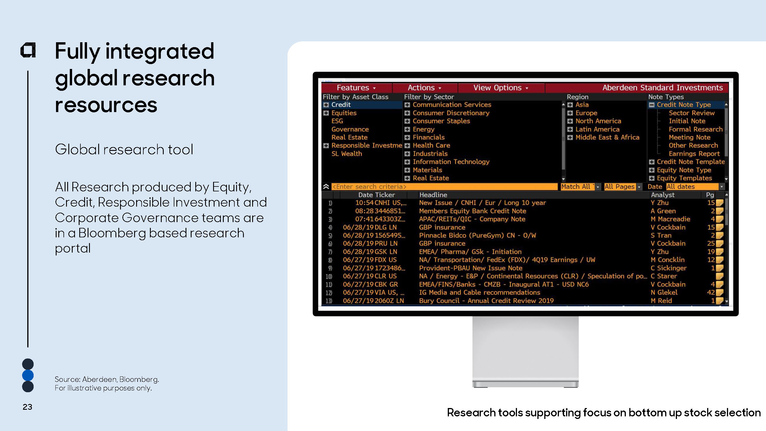 Fully integrated global research resources Global research tool All Research produced by Equity, Credit, Responsible Investment and Corporate Governance teams are in a Bloomberg based research portal Source: Aberdeen, Bloomberg. For illustrative purposes only. Research tools supporting focus on bottom up stock selection 23