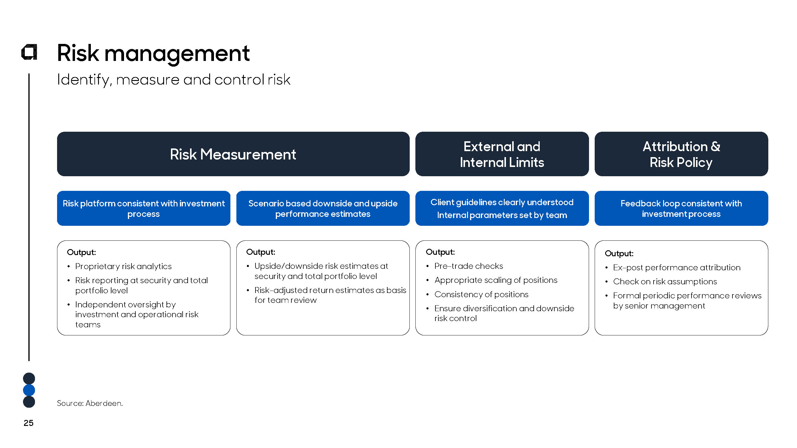 Portfolio construction Active weights sized in accordance with analyst conviction levels Potential investment idea Quantify risk adjusted total return profile Scale according to strength of view Identify impact on overall portfolio Position sizing/sector exposure Factor sensitivities Duration impact Liquidity analysis Correlation, beta exposures Volatility Tracking error Diversified portfolio based on client guidelines and expectations Source: Aberdeen. Credit selection tailored to the overall environment 24
