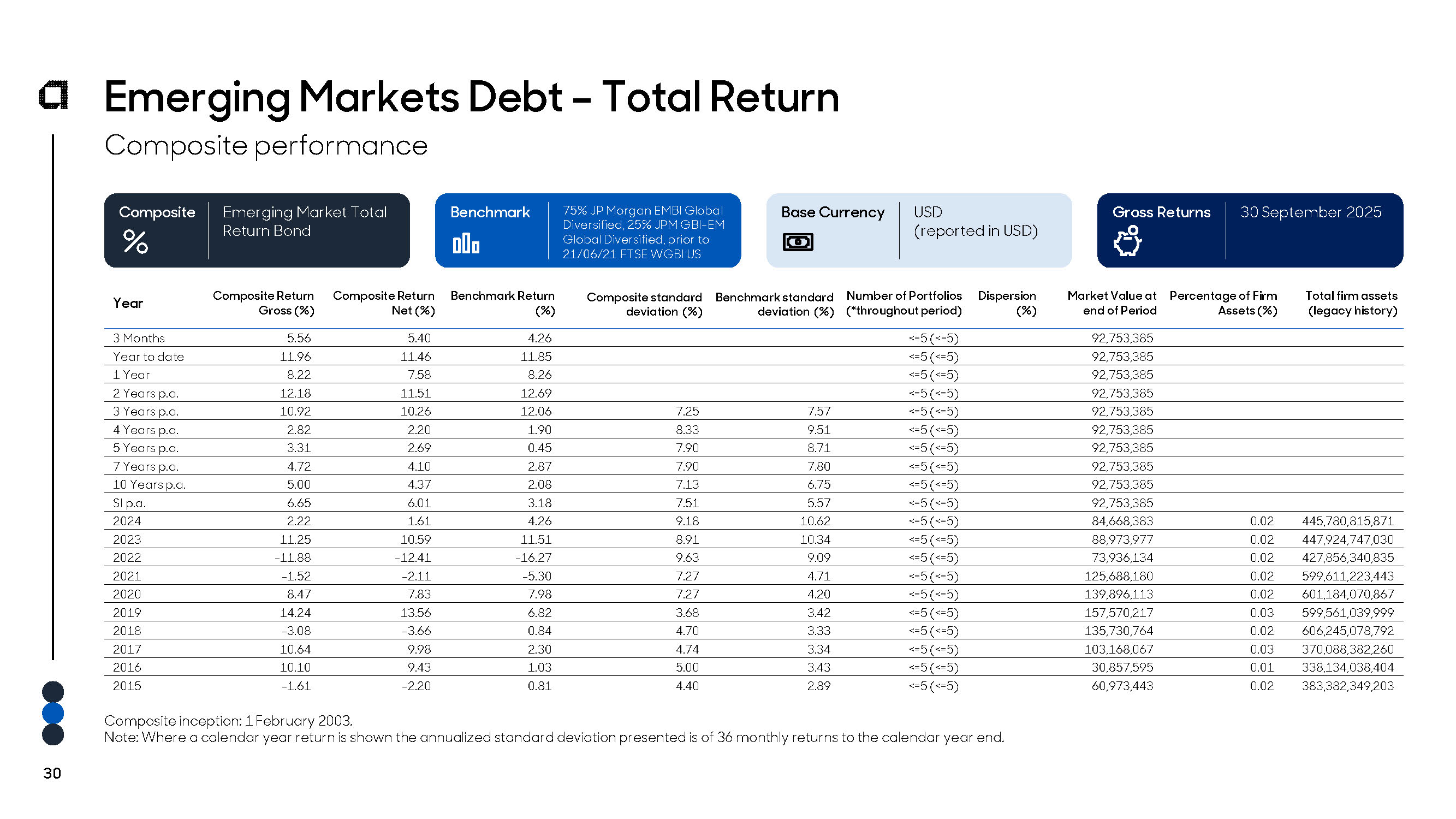 Emerging Markets Debt – Total Return Composite performance Composite Emerging Market Total Return Bond Benchmark 75% JP Morgan EMBI Global Diversified, 25% JPM GBI-EM Global Diversified, prior to 21/06/21 FTSE WGBI US Base Currency USD (reported in USD) Gross Returns 30 September 2025 Year Composite Return Gross (%) Composite Return Net (%) Benchmark Return (%) Composite standard deviation (%) Benchmark standard deviation (%) Number of Portfolios (*throughout period) Dispersion (%) Market Value at end of Period Percentage of Firm Assets (%) Total firm assets (legacy history) 3 Months 5.56 5.40 4.26 <=5 (<=5) 92,753,385 Year to date 11.96 11.46 11.85 <=5 (<=5) 92,753,385 1 Year 8.22 7.58 8.26 <=5 (<=5) 92,753,385 2 Years p.a. 12.18 11.51 12.69 <=5 (<=5) 92,753,385 3 Years p.a. 10.92 10.26 12.06 7.25 7.57 <=5 (<=5) 92,753,385 4 Years p.a. 2.82 2.20 1.90 8.33 9.51 <=5 (<=5) 92,753,385 5 Years p.a. 3.31 2.69 0.45 7.90 8.71 <=5 (<=5) 92,753,385 7 Years p.a. 4.72 4.10 2.87 7.90 7.80 <=5 (<=5) 92,753,385 10 Years p.a. 5.00 4.37 2.08 7.13 6.75 <=5 (<=5) 92,753,385 SI p.a. 6.65 6.01 3.18 7.51 5.57 <=5 (<=5) 92,753,385 2024 2.22 1.61 4.26 9.18 10.62 <=5 (<=5) 84,668,383 0.02 445,780,815,871 2023 11.25 10.59 11.51 8.91 10.34 <=5 (<=5) 88,973,977 0.02 447,924,747,030 2022 -11.88 -12.41 -16.27 9.63 9.09 <=5 (<=5) 73,936,134 0.02 427,856,340,835 2021 -1.52 -2.11 -5.30 7.27 4.71 <=5 (<=5) 125,688,180 0.02 599,611,223,443 2020 8.47 7.83 7.98 7.27 4.20 <=5 (<=5) 139,896,113 0.02 601,184,070,867 2019 14.24 13.56 6.82 3.68 3.42 <=5 (<=5) 157,570,217 0.03 599,561,039,999 2018 -3.08 -3.66 0.84 4.70 3.33 <=5 (<=5) 135,730,764 0.02 606,245,078,792 2017 10.64 9.98 2.30 4.74 3.34 <=5 (<=5) 103,168,067 0.03 370,088,382,260 2016 10.10 9.43 1.03 5.00 3.43 <=5 (<=5) 30,857,595 0.01 338,134,038,404 2015 -1.61 -2.20 0.81 4.40 2.89 <=5 (<=5) 60,973,443 0.02 383,382,349,203 Composite inception: 1 February 2003. Note: Where a calendar year return is shown the annualized standard deviation presented is of 36 monthly returns to the calendar year end. 30