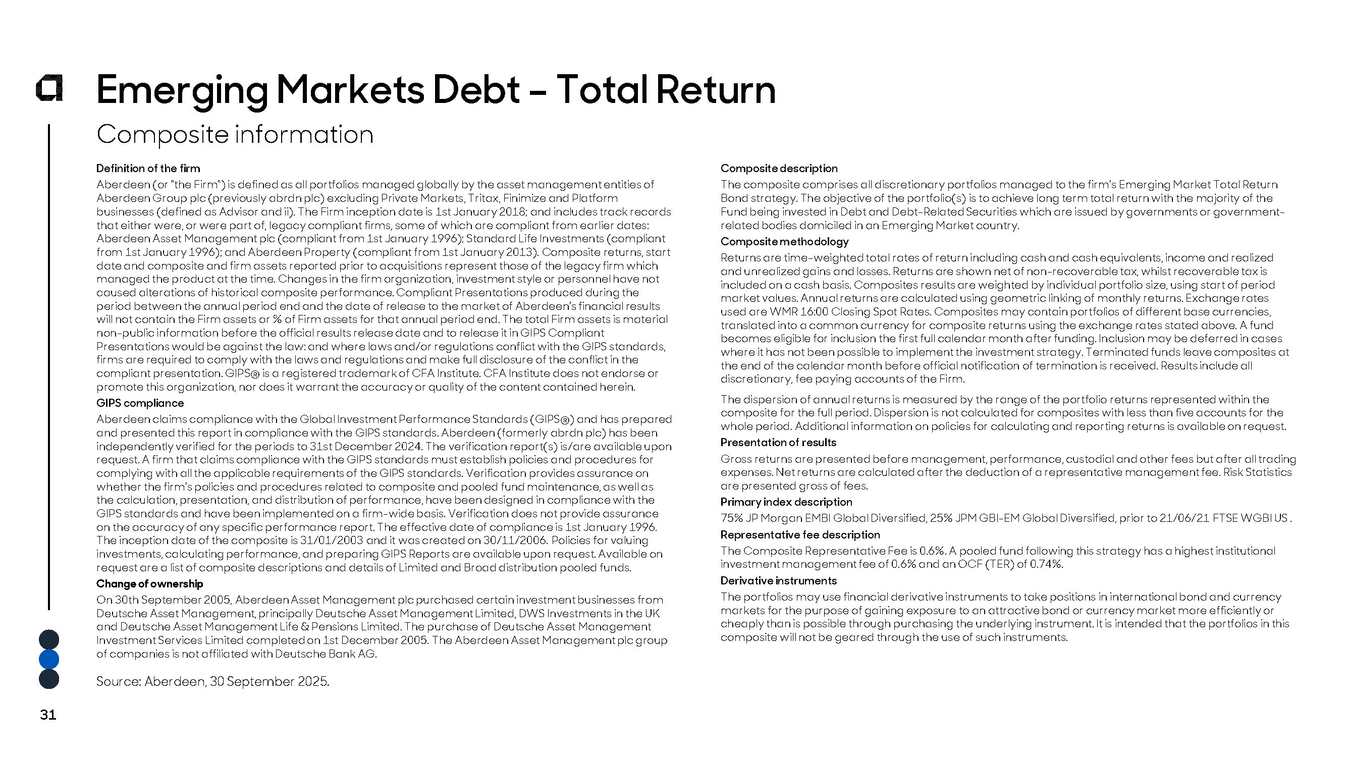 Emerging Markets Debt – Total Return Composite information Definition of the firm Aberdeen (or "the Firm") is defined as all portfolios managed globally by the asset management entities of Aberdeen Group plc (previously abrdn plc) excluding Private Markets, Tritax, Finimize and Platform businesses (defined as Advisor and ii). The Firm inception date is 1st January 2018; and includes track records that either were, or were part of, legacy compliant firms, some of which are compliant from earlier dates: Aberdeen Asset Management plc (compliant from 1st January 1996); Standard Life Investments (compliant from 1st January 1996); and Aberdeen Property (compliant from 1st January 2013). Composite returns, start date and composite and firm assets reported prior to acquisitions represent those of the legacy firm which managed the product at the time. Changes in the firm organization, investment style or personnel have not caused alterations of historical composite performance. Compliant Presentations produced during the period between the annual period end and the date of release to the market of Aberdeen's financial results will not contain the Firm assets or % of Firm assets for that annual period end. The total Firm assets is material non-public information before the official results release date and to release it in GIPS Compliant Presentations would be against the law: and where laws and/or regulations conflict with the GIPS standards, firms are required to comply with the laws and regulations and make full disclosure of the conflict in the compliant presentation. GIPS® is a registered trademark of CFA Institute. CFA Institute does not endorse or promote this organization, nor does it warrant the accuracy or quality of the content contained herein. GIPS compliance Aberdeen claims compliance with the Global Investment Performance Standards (GIPS®) and has prepared and presented this report in compliance with the GIPS standards. Aberdeen (formerly abrdn plc) has been independently verified for the periods to 31st December 2024. The verification report(s) is/are available upon request. A firm that claims compliance with the GIPS standards must establish policies and procedures for complying with all the applicable requirements of the GIPS standards. Verification provides assurance on whether the firm's policies and procedures related to composite and pooled fund maintenance, as well as the calculation, presentation, and distribution of performance, have been designed in compliance with the GIPS standards and have been implemented on a firm-wide basis. Verification does not provide assurance on the accuracy of any specific performance report. The effective date of compliance is 1st January 1996. The inception date of the composite is 31/01/2003 and it was created on 30/11/2006. Policies for valuing investments, calculating performance, and preparing GIPS Reports are available upon request. Available on request are a list of composite descriptions and details of Limited and Broad distribution pooled funds. Change of ownership On 30th September 2005, Aberdeen Asset Management plc purchased certain investment businesses from Deutsche Asset Management, principally Deutsche Asset Management Limited, DWS Investments in the UK and Deutsche Asset Management Life & Pensions Limited. The purchase of Deutsche Asset Management Investment Services Limited completed on 1st December 2005. The Aberdeen Asset Management plc group of companies is not affiliated with Deutsche Bank AG. Composite description The composite comprises all discretionary portfolios managed to the firm's Emerging Market Total Return Bond strategy. The objective of the portfolio(s) is to achieve long term total return with the majority of the Fund being invested in Debt and Debt-Related Securities which are issued by governments or government- related bodies domiciled in an Emerging Market country. Composite methodology Returns are time-weighted total rates of return including cash and cash equivalents, income and realized and unrealized gains and losses. Returns are shown net of non-recoverable tax, whilst recoverable tax is included on a cash basis. Composites results are weighted by individual portfolio size, using start of period market values. Annual returns are calculated using geometric linking of monthly returns. Exchange rates used are WMR 16:00 Closing Spot Rates. Composites may contain portfolios of different base currencies, translated into a common currency for composite returns using the exchange rates stated above. A fund becomes eligible for inclusion the first full calendar month after funding. Inclusion may be deferred in cases where it has not been possible to implement the investment strategy. Terminated funds leave composites at the end of the calendar month before official notification of termination is received. Results include all discretionary, fee paying accounts of the Firm. The dispersion of annual returns is measured by the range of the portfolio returns represented within the composite for the full period. Dispersion is not calculated for composites with less than five accounts for the whole period. Additional information on policies for calculating and reporting returns is available on request. Presentation of results Gross returns are presented before management, performance, custodial and other fees but after all trading expenses. Net returns are calculated after the deduction of a representative management fee. Risk Statistics are presented gross of fees. Primary index description 75% JP Morgan EMBI Global Diversified, 25% JPM GBI-EM Global Diversified, prior to 21/06/21 FTSE WGBI US . Representative fee description The Composite Representative Fee is 0.6%. A pooled fund following this strategy has a highest institutional investment management fee of 0.6% and an OCF (TER) of 0.74%. Derivative instruments The portfolios may use financial derivative instruments to take positions in international bond a
