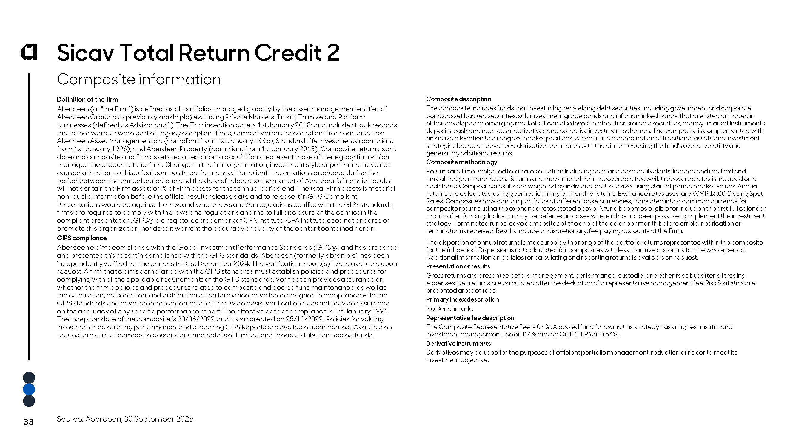 Sicav Total Return Credit 2 Composite information Definition of the firm Aberdeen (or "the Firm") is defined as all portfolios managed globally by the asset management entities of Aberdeen Group plc (previously abrdn plc) excluding Private Markets, Tritax, Finimize and Platform businesses (defined as Advisor and ii). The Firm inception date is 1st January 2018; and includes track records that either were, or were part of, legacy compliant firms, some of which are compliant from earlier dates: Aberdeen Asset Management plc (compliant from 1st January 1996); Standard Life Investments (compliant from 1st January 1996); and Aberdeen Property (compliant from 1st January 2013). Composite returns, start date and composite and firm assets reported prior to acquisitions represent those of the legacy firm which managed the product at the time. Changes in the firm organization, investment style or personnel have not caused alterations of historical composite performance. Compliant Presentations produced during the period between the annual period end and the date of release to the market of Aberdeen's financial results will not contain the Firm assets or % of Firm assets for that annual period end. The total Firm assets is material non-public information before the official results release date and to release it in GIPS Compliant Presentations would be against the law: and where laws and/or regulations conflict with the GIPS standards, firms are required to comply with the laws and regulations and make full disclosure of the conflict in the compliant presentation. GIPS® is a registered trademark of CFA Institute. CFA Institute does not endorse or promote this organization, nor does it warrant the accuracy or quality of the content contained herein. GIPS compliance Aberdeen claims compliance with the Global Investment Performance Standards (GIPS®) and has prepared and presented this report in compliance with the GIPS standards. Aberdeen (formerly abrdn plc) has been independently verified for the periods to 31st December 2024. The verification report(s) is/are available upon request. A firm that claims compliance with the GIPS standards must establish policies and procedures for complying with all the applicable requirements of the GIPS standards. Verification provides assurance on whether the firm's policies and procedures related to composite and pooled fund maintenance, as well as the calculation, presentation, and distribution of performance, have been designed in compliance with the GIPS standards and have been implemented on a firm-wide basis. Verification does not provide assurance on the accuracy of any specific performance report. The effective date of compliance is 1st January 1996. The inception date of the composite is 30/06/2022 and it was created on 25/10/2022. Policies for valuing investments, calculating performance, and preparing GIPS Reports are available upon request. Available on request are a list of composite descriptions and details of Limited and Broad distribution pooled funds. Composite description The composite includes funds that invest in higher yielding debt securities, including government and corporate bonds, asset backed securities, sub investment grade bonds and inflation linked bonds, that are listed or traded in either developed or emerging markets. It can also invest in other transferable securities, money-market instruments, deposits, cash and near cash, derivatives and collective investment schemes. The composite is complemented with an active allocation to a range of market positions, which utilize a combination of traditional assets and investment strategies based on advanced derivative techniques with the aim of reducing the fund's overall volatility and generating additional returns. Composite methodology Returns are time-weighted total rates of return including cash and cash equivalents, income and realized and unrealized gains and losses. Returns are shown net of non-recoverable tax, whilst recoverable tax is included on a cash basis. Composites results are weighted by individual portfolio size, using start of period market values. Annual returns are calculated using geometric linking of monthly returns. Exchange rates used are WMR 16:00 Closing Spot Rates. Composites may contain portfolios of different base currencies, translated into a common currency for composite returns using the exchange rates stated above. A fund becomes eligible for inclusion the first full calendar month after funding. Inclusion may be deferred in cases where it has not been possible to implement the investment strategy. Terminated funds leave composites at the end of the calendar month before official notification of termination is received. Results include all discretionary, fee paying accounts of the Firm. The dispersion of annual returns is measured by the range of the portfolio returns represented within the composite for the full period. Dispersion is not calculated for composites with less than five accounts for the whole period. Additional information on policies for calculating and reporting returns is available on request. Presentation of results Gross returns are presented before management, performance, custodial and other fees but after all trading expenses. Net returns are calculated after the deduction of a representative management fee. Risk Statistics are presented gross of fees. Primary index description No Benchmark . Representative fee description The Composite Representative Fee is 0.4%. A pooled fund following this strategy has a highest institutional investment management fee of 0.4% and an OCF (TER) of 0.54%. Derivative instruments Derivatives may be used for the purposes of efficient portfolio management, reduction of risk or to meet its investment objective. Source: Aberdeen, 30 September 2025. 33