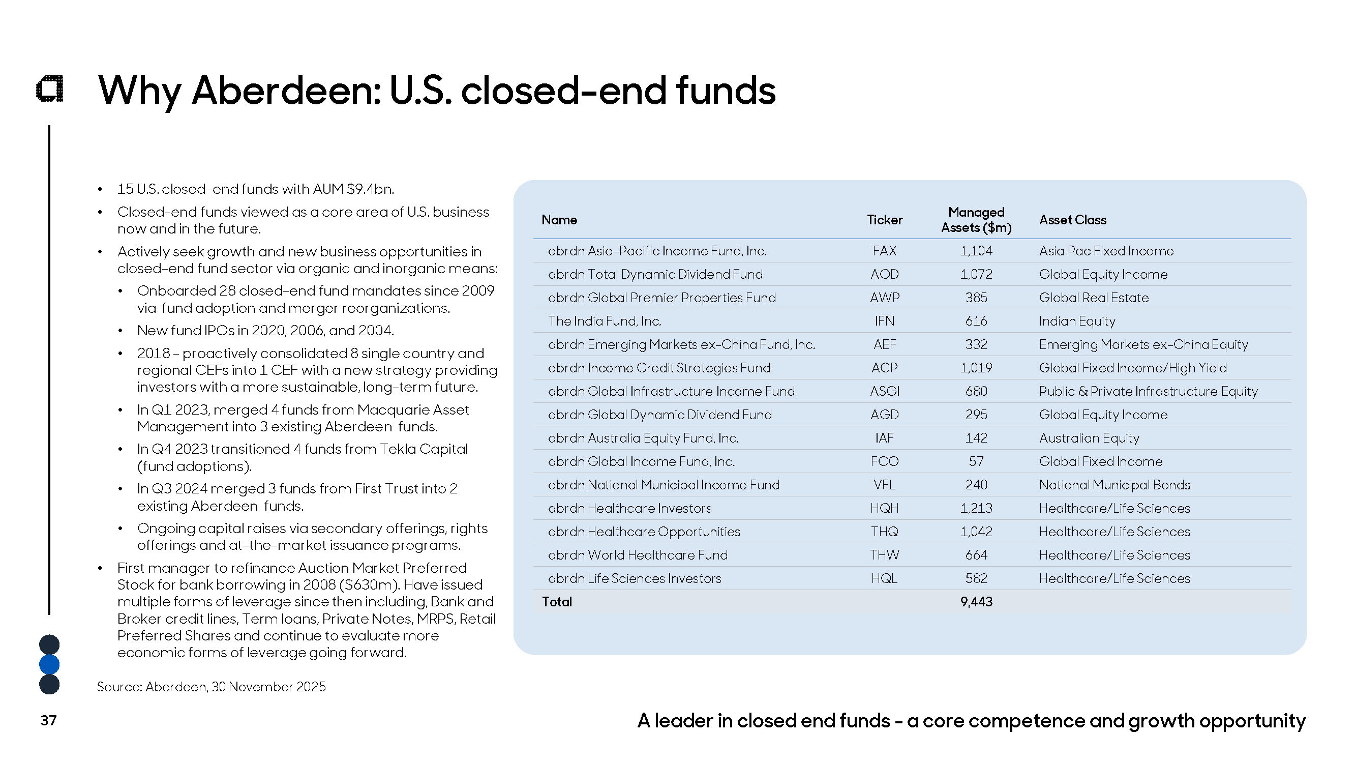 Why Aberdeen: CEF transaction experience Aberdeen is extremely experienced in the execution of CEF transactions: • Our goal is to make any transaction as seamless as possible for the Board and shareholders • Our U.S. closed-end fund business has been developed through IPO and secondary market fund raising, but primarily from targeted acquisitions, beginning with EquitiLink in 2000. Since then, we have acquired U.S. CEF management contracts from: • Credit Suisse (2008) • Blackstone (2012) • Daiwa (2013) • Alpine Woods (2017) • Avenue Capital (2017) • Macquarie/Delaware Funds (2023) • Tekla Capital (2023) • First Trust (2024) • The transactions above have involved all types of fund transactions: • Transition of management contracts • Fund adoptions • Merger reorganizations Long history and deep expertise in delivering successful execution of CEF transactions 36