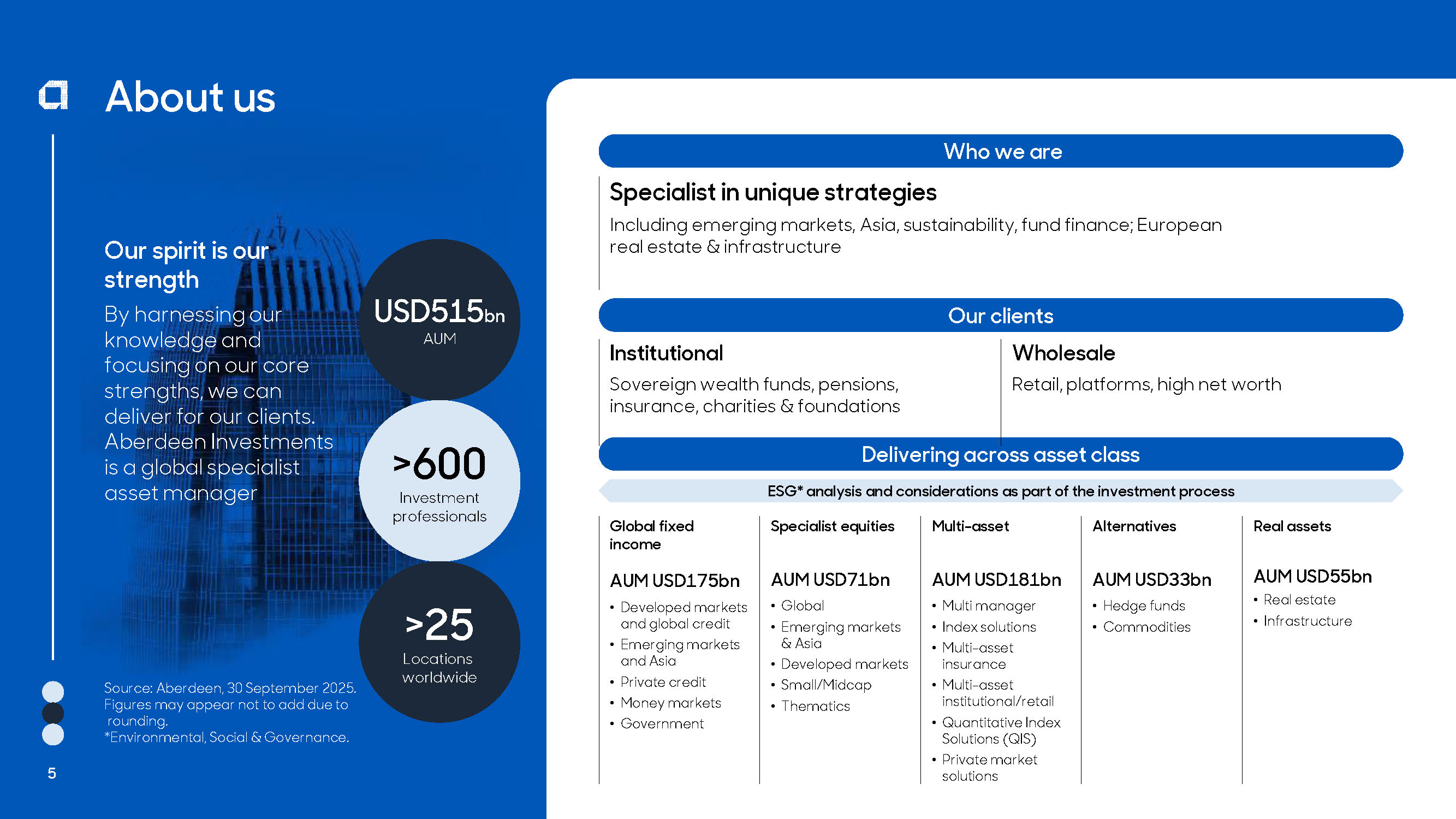 Our spirit is our strength We are Aberdeen Investments For over a century, we’ve been investing with a certain spirit. The spirit of Scotland. Discover the spirit that makes us the company we are. USD 516bn AUM >600 Investment professionals >25 Locations worldwide Source: Aberdeen, 30 September 2025. Figures may appear not to add due to rounding. 38