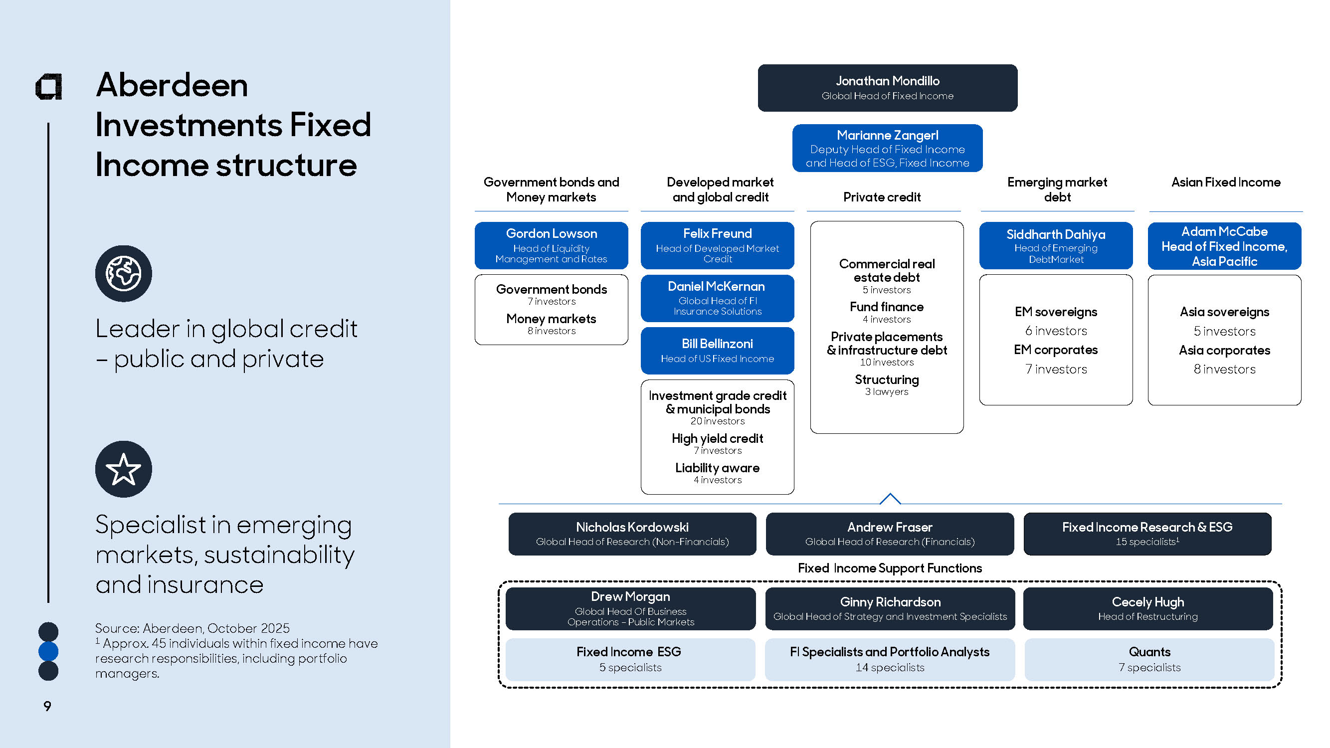 Aberdeen Fixed Income USD175bn* AUM 0.78 information ratio over long term in 8 key strategies across Fixed Income1 400+ Fixed Income led ESG engagements with issuers a year2 140+ investment professionals globally Source: Aberdeen, October 2025. Figures may appear not to add due to rounding. AUM figures shown include allocations from multi asset portfolios. 1 Equally weighted 3 year rolling average across 7 years to end December 2024 for Global Credit, Euro Credit, Euro Credit Sustainable, US Credit, Sterling Credit, Emerging Market Corporates, EMD Local and Hard Currency Fund (since inception in 2018), Euro High Yield. Information Ratio: Excess return versus a benchmark divided by the volatility of that excess return (tracking error), indicating risk-adjusted active performance. 2 ESG (Environmental, Social and Governance) engagements = Fixed Income team interactions with companies where ESG was logged as a topic. As of October 2024-2025 * This figure includes the AUM for Aberdeen global liquidity and private credit. Who we are One of the leaders in global credit – public and private Specialist in emerging markets, sustainability and insurance Differentiators Credit confidence across market cycles: In both public and private markets Access to specialist strategies: Including emerging markets, private credit sustainability Outcomes driven: Whether it’s capital preservation, growth and income, insurance focused or other bespoke objectives 30% 41% 11% 12% 6% Developed markets and global credit Private credit Emerging market debt and Asia Government Money markets Capabilities EM debt Leveraged finance Investment grade Government Private credit Inflation linked Asia Pacific Money markets 8