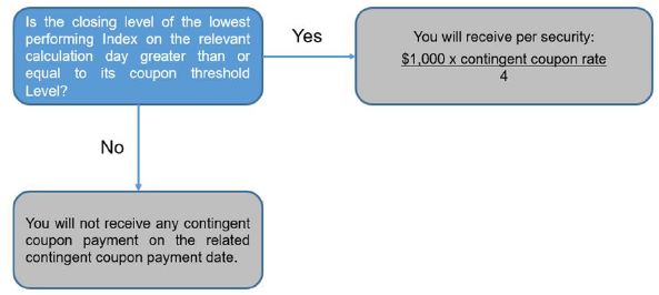 level of the lowest performing Index on the related calculation day is greater than or equal to its coupon threshold level. Each “contingent coupon payment,” if any, will be calculated per security as follows: ($1,000 × contingent