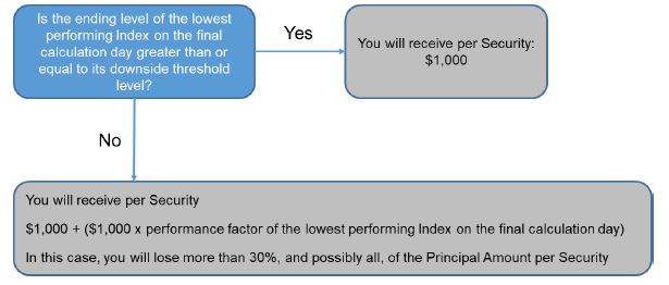 whether you receive the face amount of your securities at stated maturity will depend, in each case, on the closing level of the lowest performing Index on the relevant calculation day. The lowest performing Index on any calculation day is