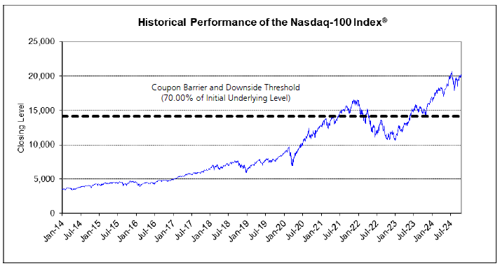 The following graph sets forth the historical performance of the NDX Index from January 2, 2014 through October 11, 2024, based on the daily Closing Levels of the NDX Index. The Closing Level of the NDX Index on October 11, 2024 was 20,271.97. The dotted line represents the Coupon Barrier and the Downside Threshold of 14,190.38, which is equal to 70.00% of the Initial Underlying Level of the NDX Index.