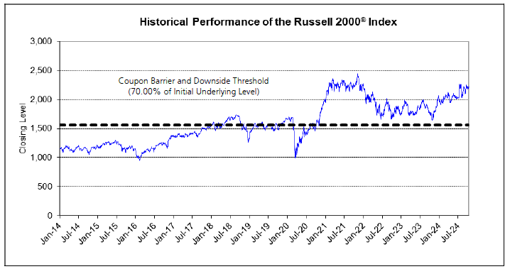 The following graph sets forth the historical performance of the RTY Index from January 2, 2014 through October 11, 2024, based on the daily Closing Levels of the RTY Index. The Closing Level of the RTY Index on October 11, 2024 was 2,234.410. The dotted line represents the Coupon Barrier and the Downside Threshold of 1,564.087, which is equal to 70.00% of the Initial Underlying Level of the RTY Index.