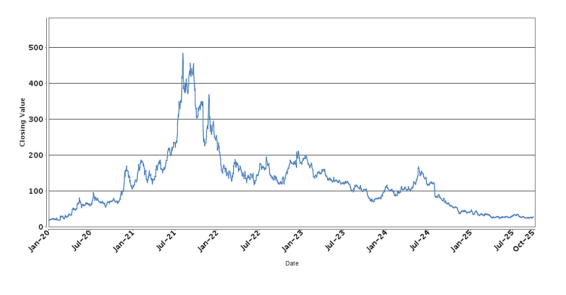 The graph below sets forth the historical performance of Lyft, Inc. based on the daily Closing Value from January 6, 2020 through October 1, 2025. We obtained the Closing Values shown in the graph below from Bloomberg. We have not independently verified the accuracy or completeness of the information obtained from Bloomberg. These historical closing values may have been adjusted to reflect certain corporate actions such as stock splits and reverse stock splits.