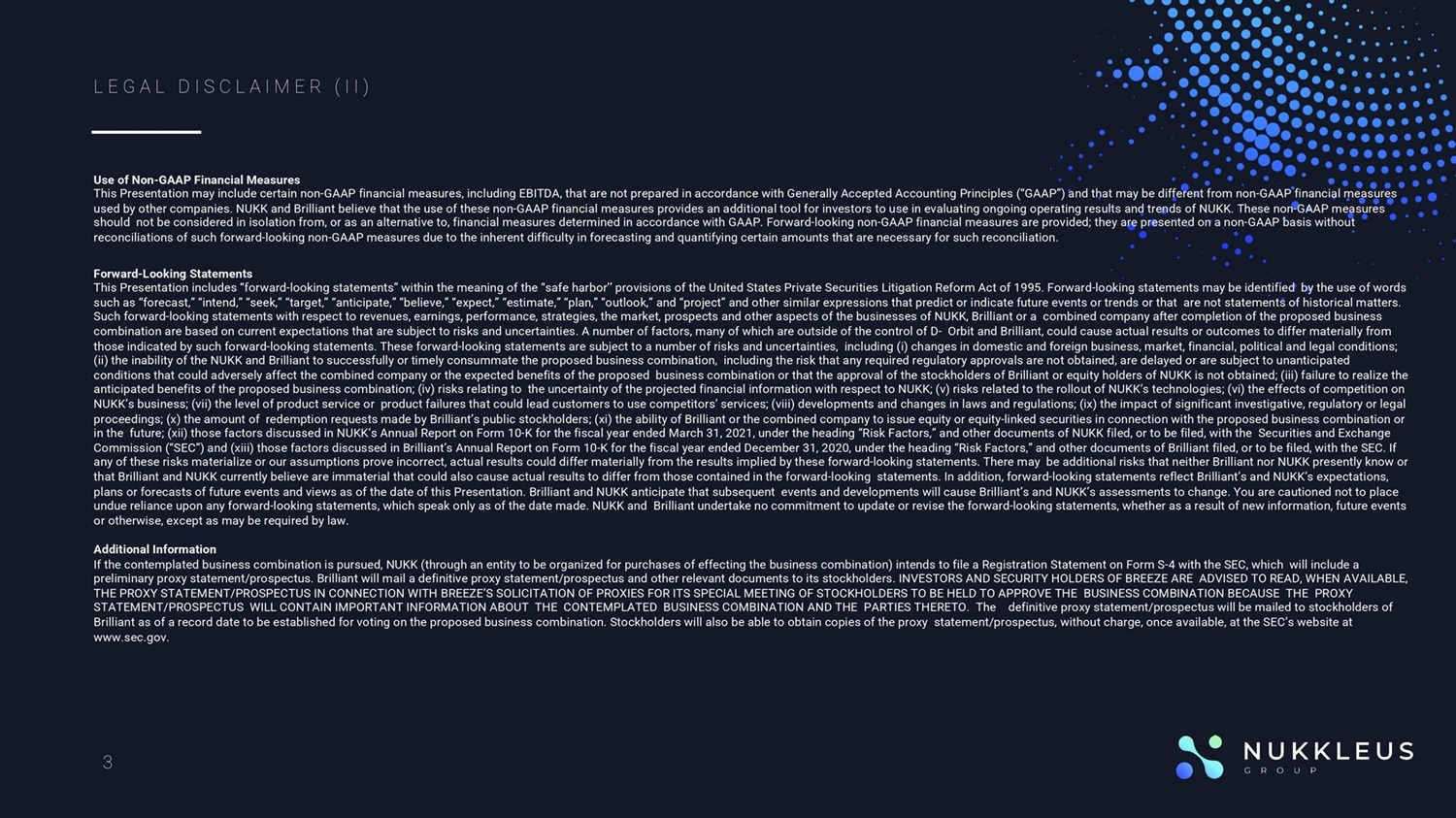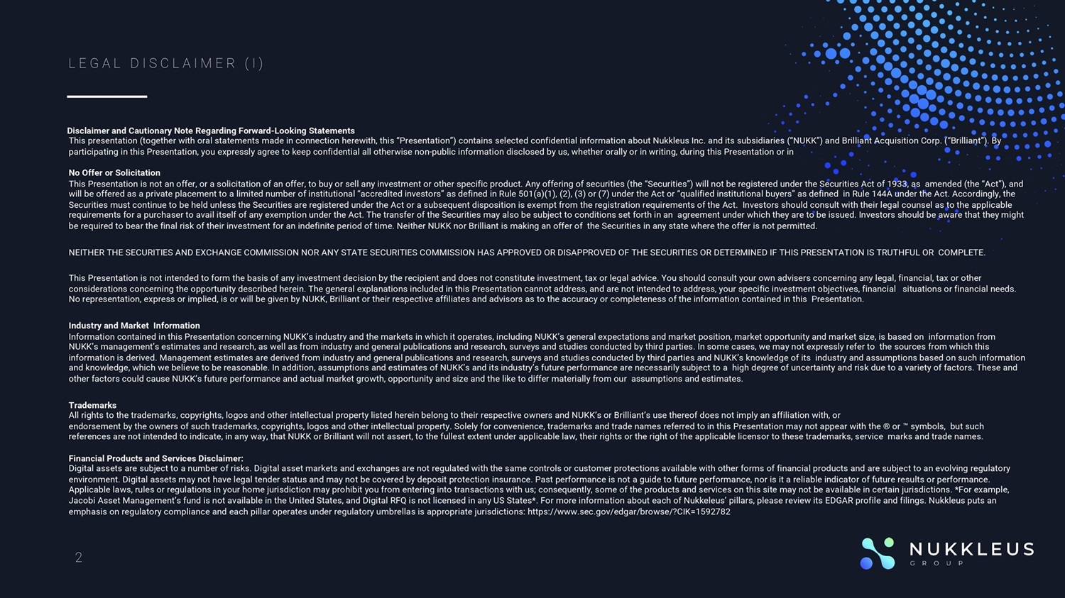 The Merger Agreement provides that, among other things, at the closing (the “Closing”) of the transactions contemplated by the Merger Agreement, Merger Sub merged with and into Old Nukk (the “Merger”), with Old Nukk surviving as a wholly-owned subsidiary of Brilliant. In connection with the Merger, Brilliant changed its name to “Nukkleus Inc.” (“Nukkleus” or “Combined Company”). The Merger and other transactions contemplated by the Merger Agreement are hereinafter referred to as the “Business Combination.”