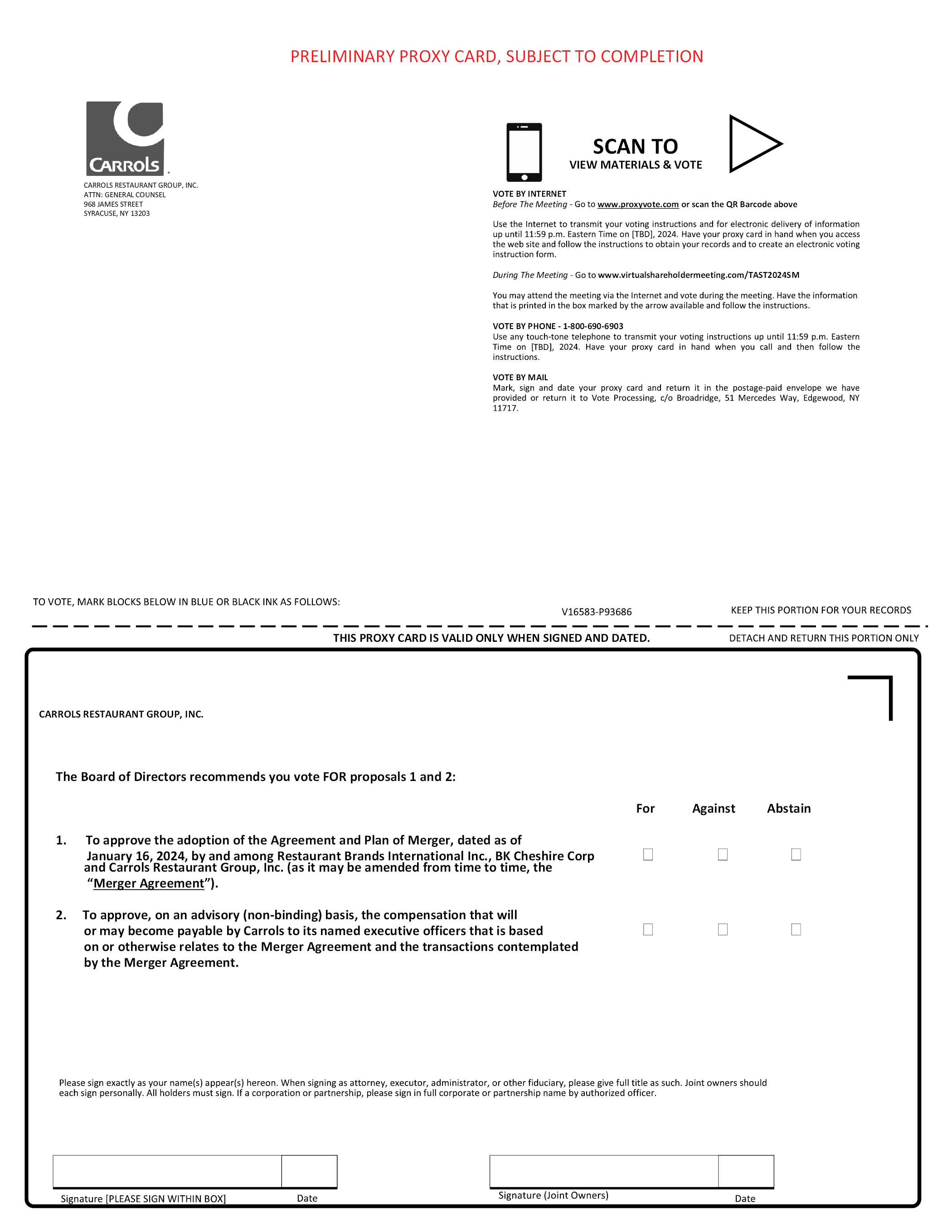 PRELIMINARY PROXY CARD, SUBJECT TO COMPLETION CARROLS RESTAURANT GROUP, INC. ATTN: GENERAL COUNSEL 968 JAMES STREET SYRACUSE, NY 13203 SCAN TO VIEW MATERIALS & VOTE VOTE BY INTERNET Before The Meeting - Go to www.proxyvote.com or scan the QR Barcode above Use the Internet to transmit your voting instructions and for electronic delivery of information up until 11:59 p.m. Eastern Time on [TBD], 2024. Have your proxy card in hand when you access the web site and follow the instructions to obtain your records and to create an electronic voting instruction form. During The Meeting - Go to www.virtualshareholdermeeting.com/TAST2024SM You may attend the meeting via the Internet and vote during the meeting. Have the information that is printed in the box marked by the arrow available and follow the instructions. VOTE BY PHONE - 1-800-690-6903 Use any touch-tone telephone to transmit your voting instructions up until 11:59 p.m. Eastern Time on [TBD], 2024. Have your proxy card in hand when you call and then follow the instructions. VOTE BY MAIL Mark, sign and date your proxy card and return it in the postage-paid envelope we have provided or return it to Vote Processing, c/o Broadridge, 51 Mercedes Way, Edgewood, NY 11717. TO VOTE, MARK BLOCKS BELOW IN BLUE OR BLACK INK AS FOLLOWS: V16583-P93686 KEEP THIS PORTION FOR YOUR RECORDS THIS PROXY CARD IS VALID ONLY WHEN SIGNED AND DATED. DETACH AND RETURN THIS PORTION ONLY CARROLS RESTAURANT GROUP, INC. The Board of Directors recommends you vote FOR proposals 1 and 2: For Against Abstain 1.To approve the adoption of the Agreement and Plan of Merger, dated as of January 16, 2024, by and among Restaurant Brands International Inc., BK Cheshire Corp ,Inc. (as it may be amended from time to time, the “Merger Agreement”). 2.To approve, on an advisory (non-binding) basis, the compensation that will or may become payable by Carrols to its named executive officers that is based on or otherwise relates to the Merger Agreement and the transactions contemplated by the Merger Agreement. Please sign exactly as your name(s) appear(s) hereon. When signing as attorney, executor, administrator, or other fiduciary, please give full title as such. Joint owners should each sign personally. All holders must sign. If a corporation or partnership, please sign in full corporate or partnership name by authorized officer. Signature [PLEASE SIGN WITHIN BOX] Date Signature (Joint Owners) Date