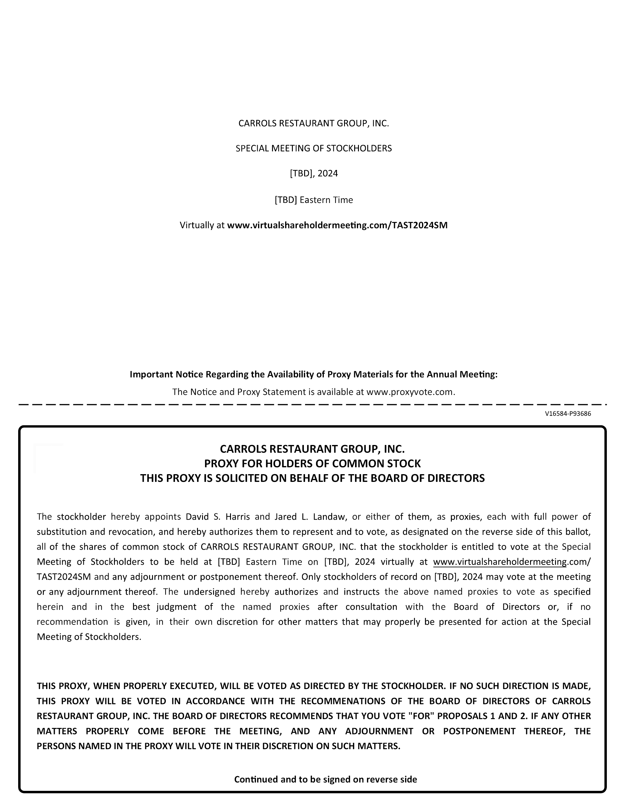 CARROLS RESTAURANT GROUP, INC. SPECIAL MEETING OF STOCKHOLDERS [TBD], 2024 [TBD] Eastern Time Virtually at www.virtualshareholdermeeting.com/TAST2024SM Important Notice Regarding the Availability of Proxy Materials for the Annual Meeting: The Notice and Proxy Statement is available at www.proxyvote.com. V16584-P93686 CARROLS RESTAURANT GROUP, INC. PROXY FOR HOLDERS OF COMMON STOCK THIS PROXY IS SOLICITED ON BEHALF OF THE BOARD OF DIRECTORS The stockholder hereby appoints David S. Harris and Jared L. Landaw, or either of them, as proxies, each with full power of substitution and revocation, and hereby authorizes them to represent and to vote, as designated on the reverse side of this ballot, all of the shares of common stock of CARROLS RESTAURANT GROUP, INC. that the stockholder is entitled to vote at the Special Meeting of Stockholders to be held at [TBD] Eastern Time on [TBD], 2024 virtually at www.virtualshareholdermeeting.com/TAST2024SM and any adjournment or postponement thereof. Only stockholders of record on [TBD], 2024 may vote at the meeting or any adjournment thereof. The undersigned hereby authorizes and instructs the above named proxies to vote as specified herein and in the best judgment of the named proxies after consultation with the Board of Directors or, if no recommendation is given, in their own discretion for other matters that may properly be presented for action at the Special Meeting of Stockholders. THIS PROXY, WHEN PROPERLY EXECUTED, WILL BE VOTED AS DIRECTED BY THE STOCKHOLDER. IF NO SUCH DIRECTION IS MADE, THIS PROXY WILL BE VOTED IN ACCORDANCE WITH THE RECOMMENATIONS OF THE BOARD OF DIRECTORS OF CARROLS RESTAURANT GROUP, INC. THE BOARD OF DIRECTORS RECOMMENDS THAT YOU VOTE “FOR” PROPOSALS 1 AND 2. IF ANY OTHER MATTERS PROPERLY COME BEFORE THE MEETING, AND ANY ADJOURNMENT OR POSTPONEMENT THEREOF, THE PERSONS NAMED IN THE PROXY WILL VOTE IN THEIR DISCRETION ON SUCH MATTERS. Continued and to be signed on reverse side